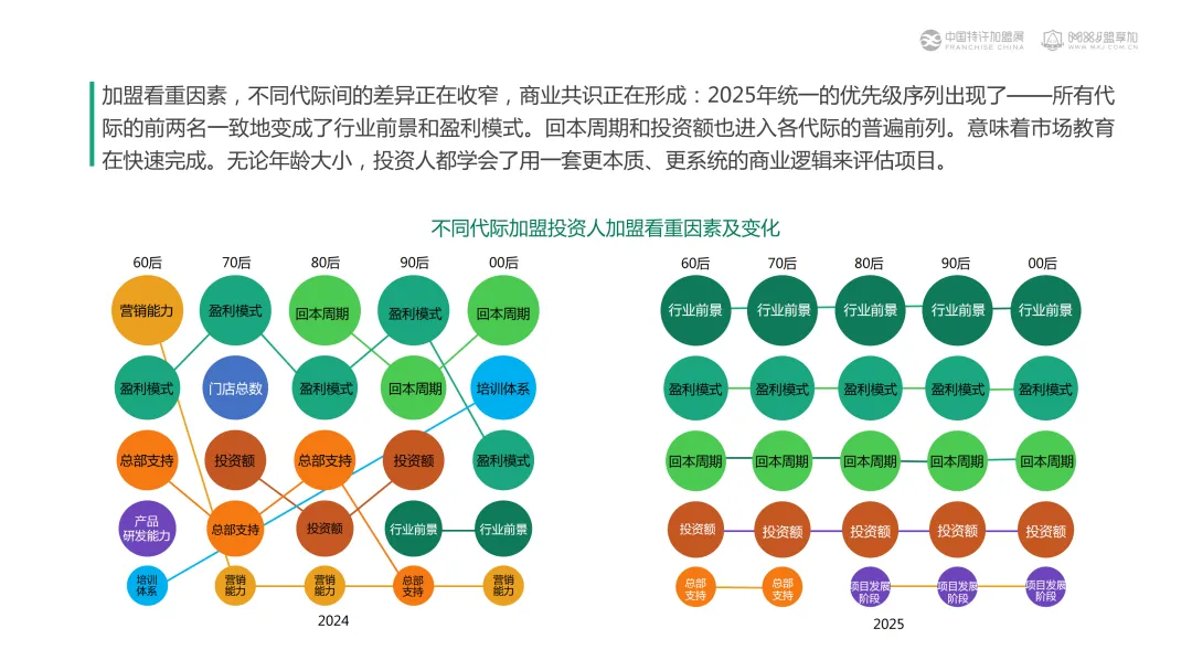 各代际前两大关注因素一致为:行业前景、盈利模式;
