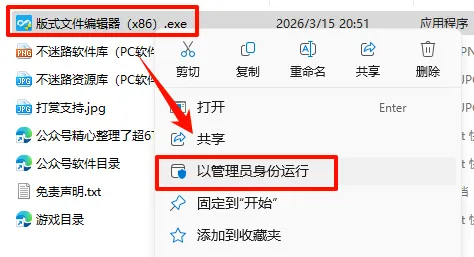 2.打开刚刚解压的文件夹,鼠标右键点击“版式文件编辑器(x86).exe”选择“以管理员身份运行”