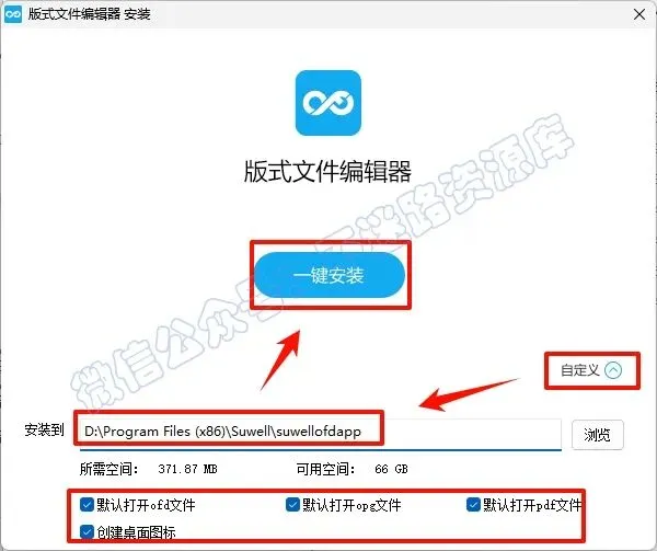3.点击“自定义”,选择软件安装路径,建议和教程中的保持一致,本例安装到D盘(将路径地址中的首字符C改为D表示安装到D盘,安装路径不要出现中文),根据需要勾选,点击“一键安装”