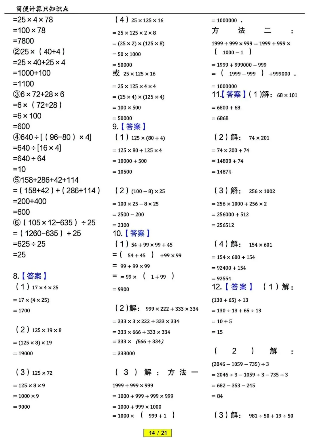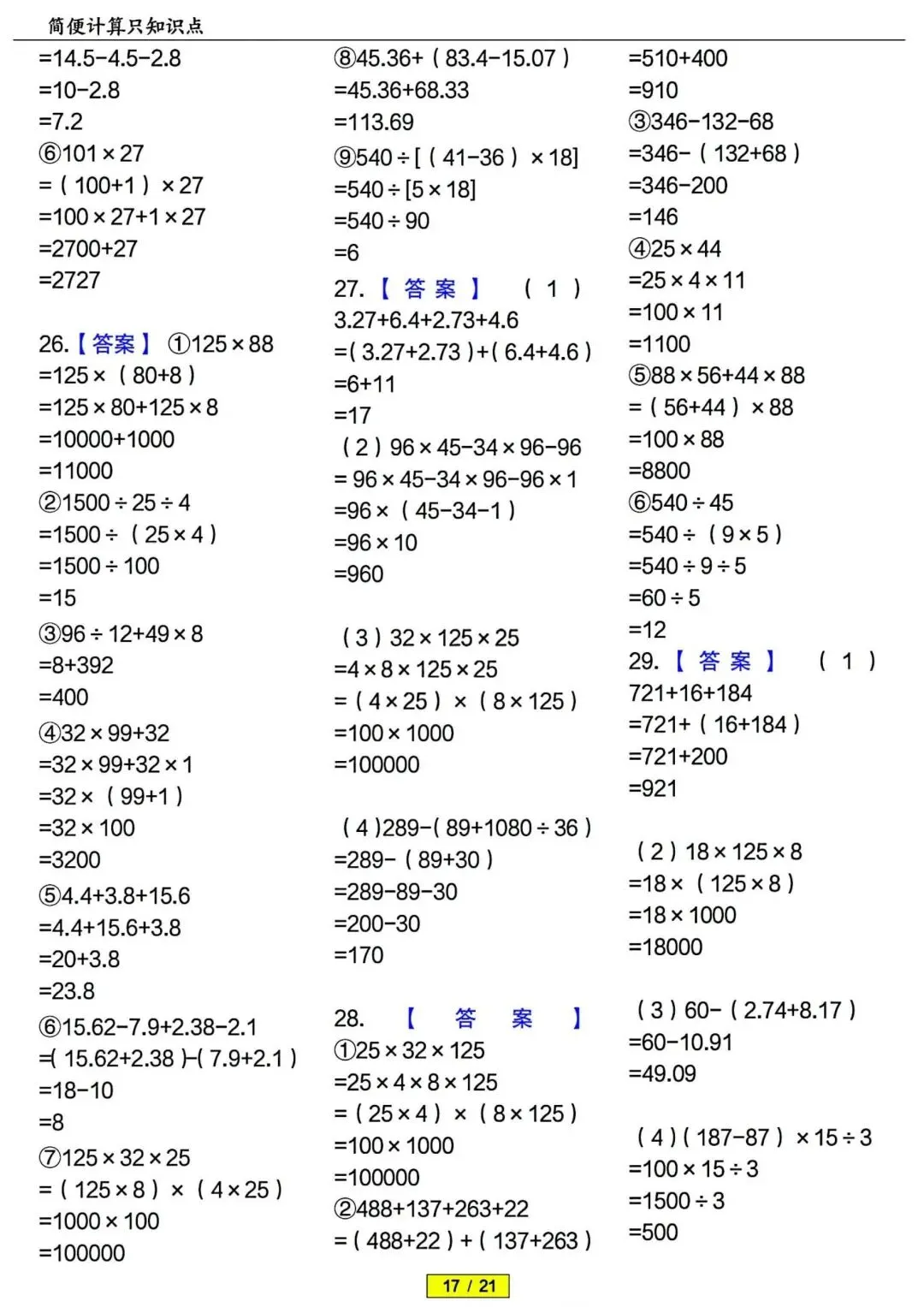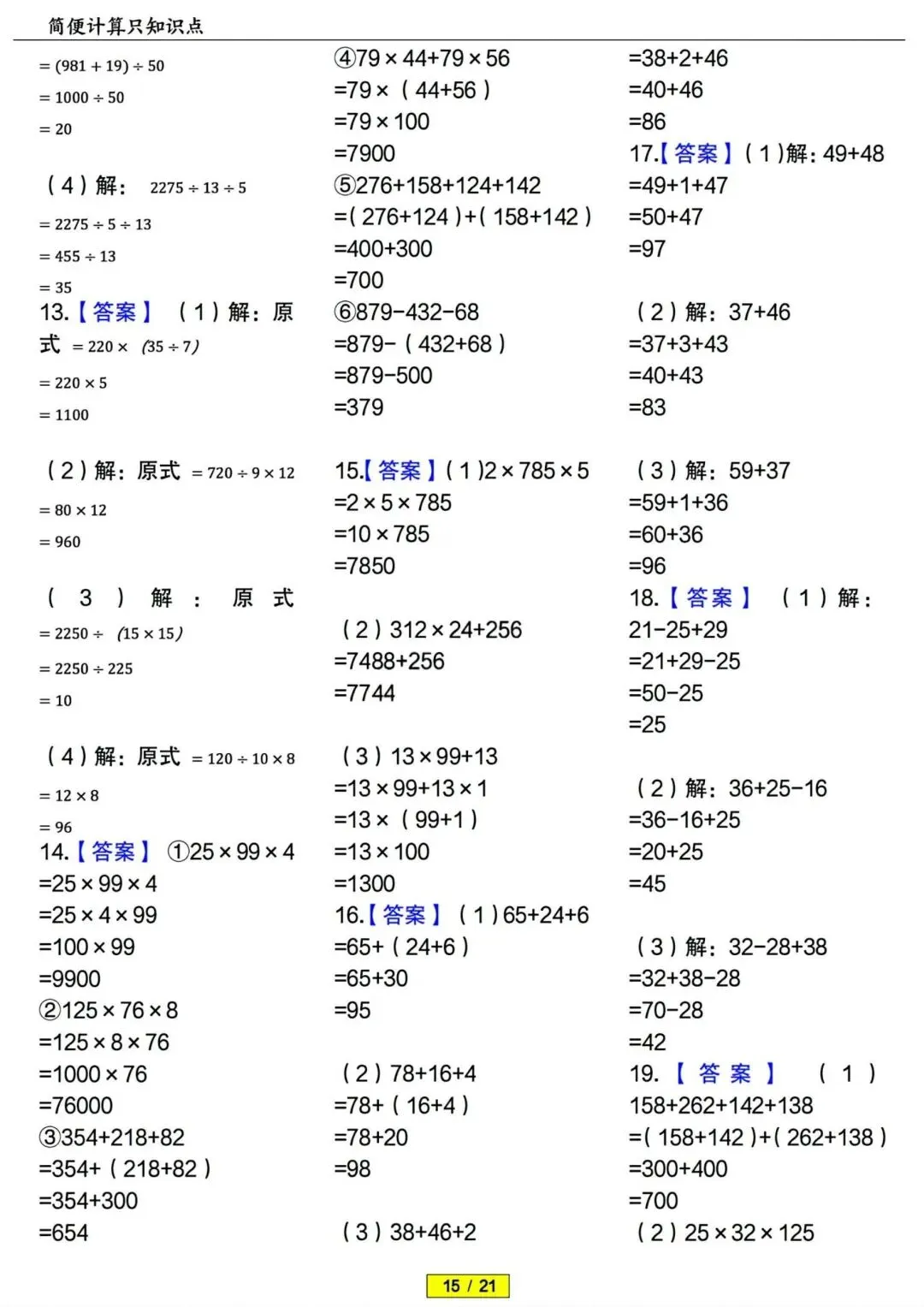 四年级下册数学简便计算专项训练 PDF电子版 四年级下册数学简便计算专项训练 PDF电子版,21页,带答案解析,老师整理的,内容全,题型丰富,题量充足,适合期末冲刺、平时练习、复习巩固用~ 领取完整电子版: ①:点一点右下角的“赞”和“在看”,感谢! ②:点击下方萌娃学习加油站,在公众号消息框发送:3321,即可免费领取