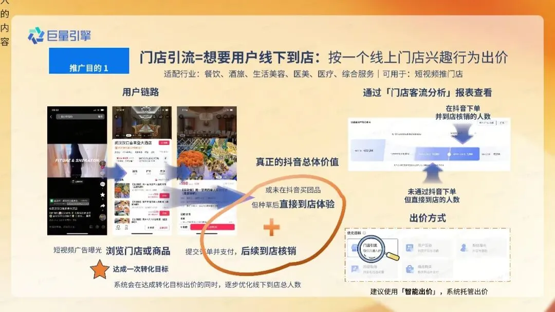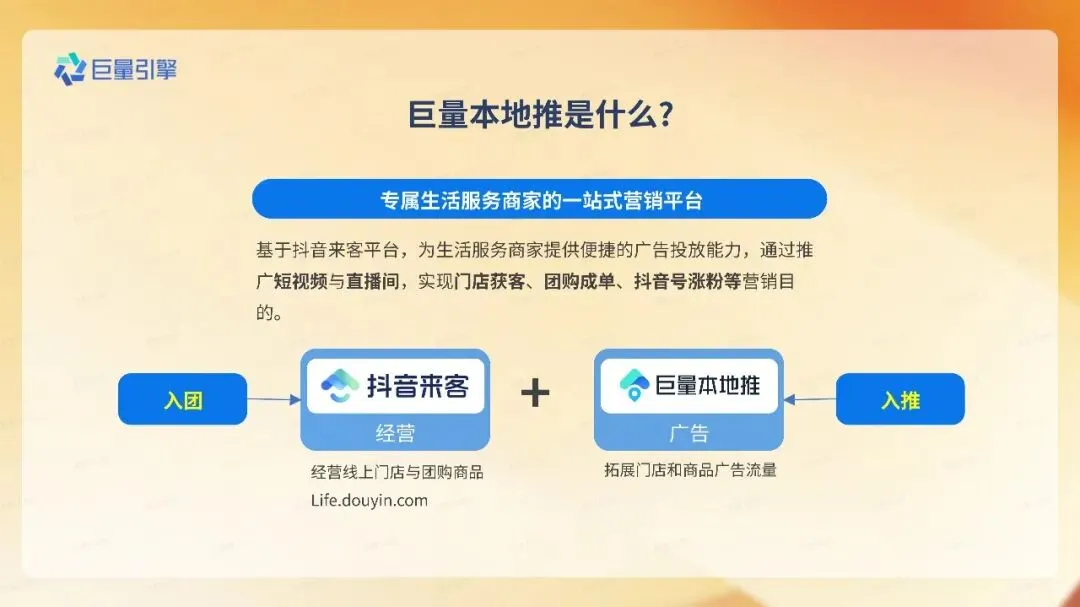 本《抖音本地推产品使用实操玩法指南》57页系统介绍了巨量本地推产品的核心功能、投放逻辑、实操后台与组合玩法。巨量本地推是抖音来客平台为生活服务商家提供的一站式营销工具,通过推广短视频与直播间,实现门店引流、团购成单、抖音号涨粉等目标。其广告可出现在信息流推荐与搜索结果中,展现形式包括短视频或直播间画面,可挂载门店POI或团购商品组件。