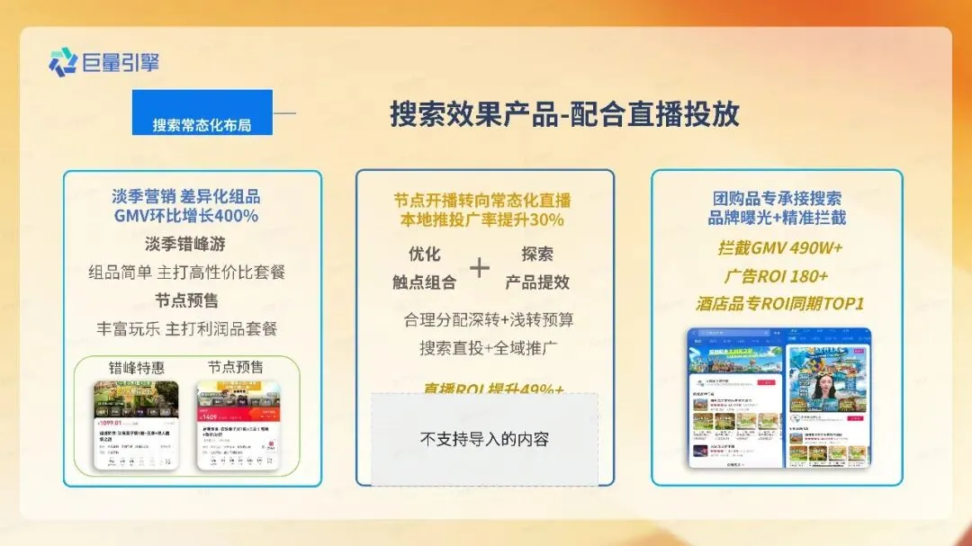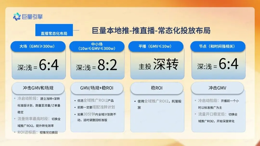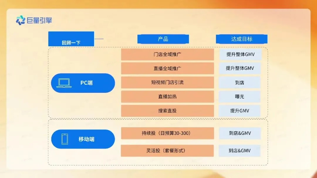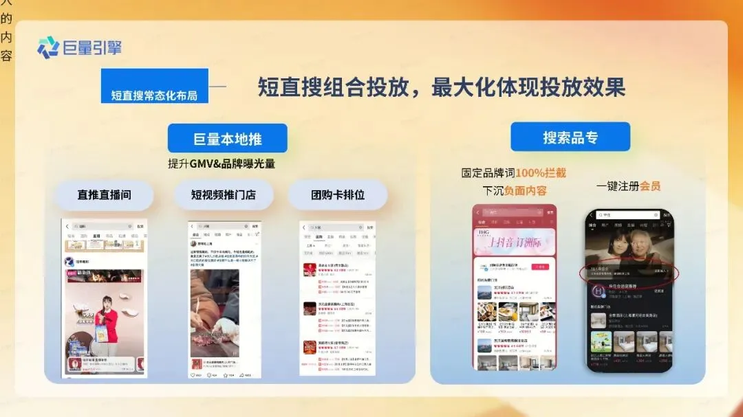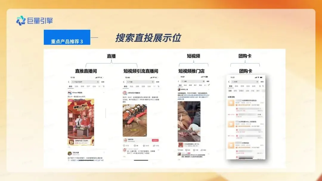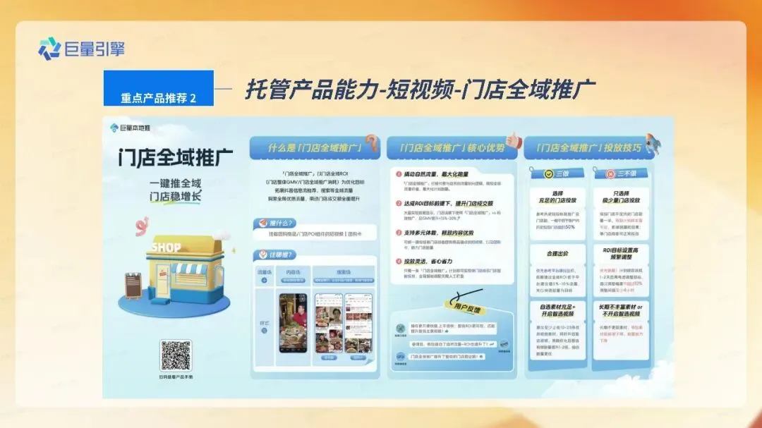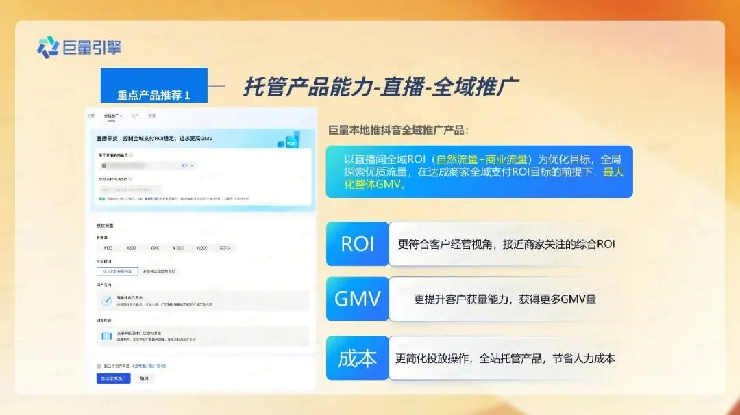 重点产品推荐包括:1)直播“全域推广”,以全域支付ROI为优化目标,最大化GMV,适用于大场冲刺与常态化经营;2)短视频“门店全域推广”,全托管模式探索全域流量,提升整体GMV;3)“搜索直投”,直接投放搜索广告,抢占搜索场景流量。