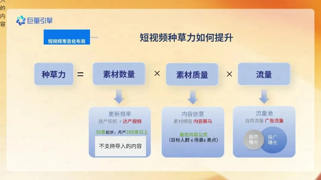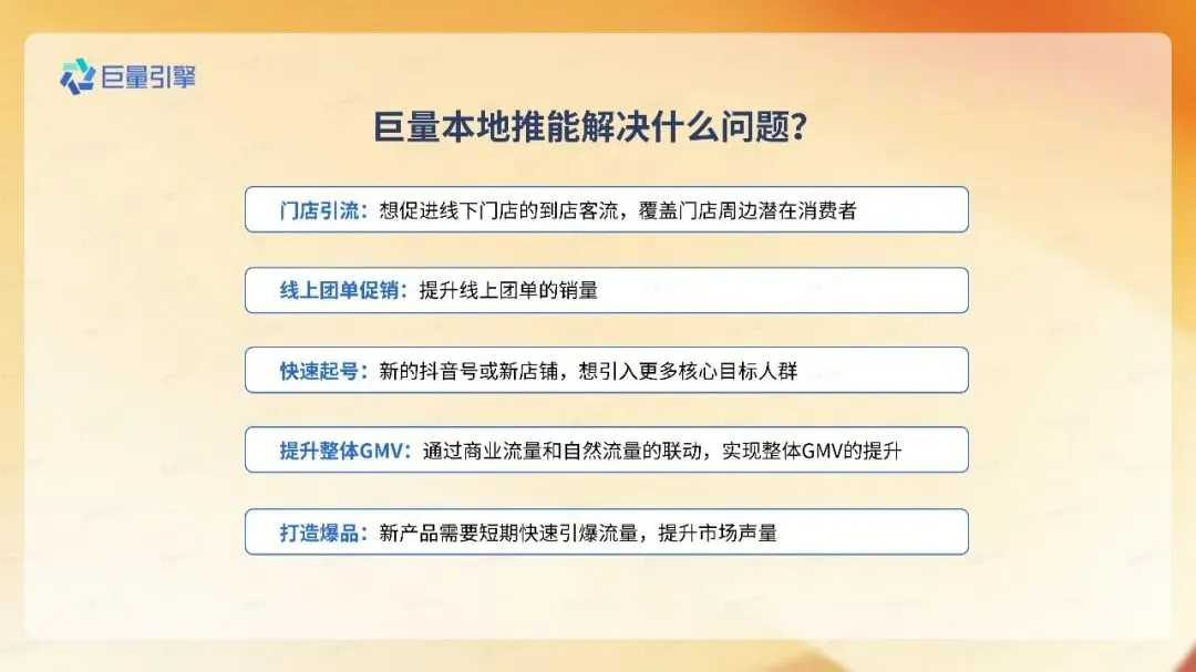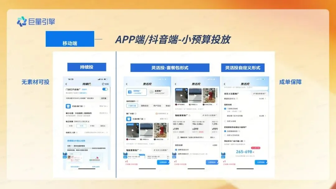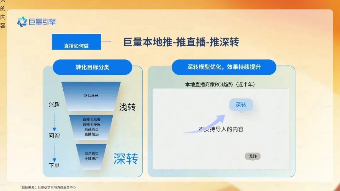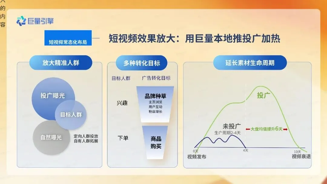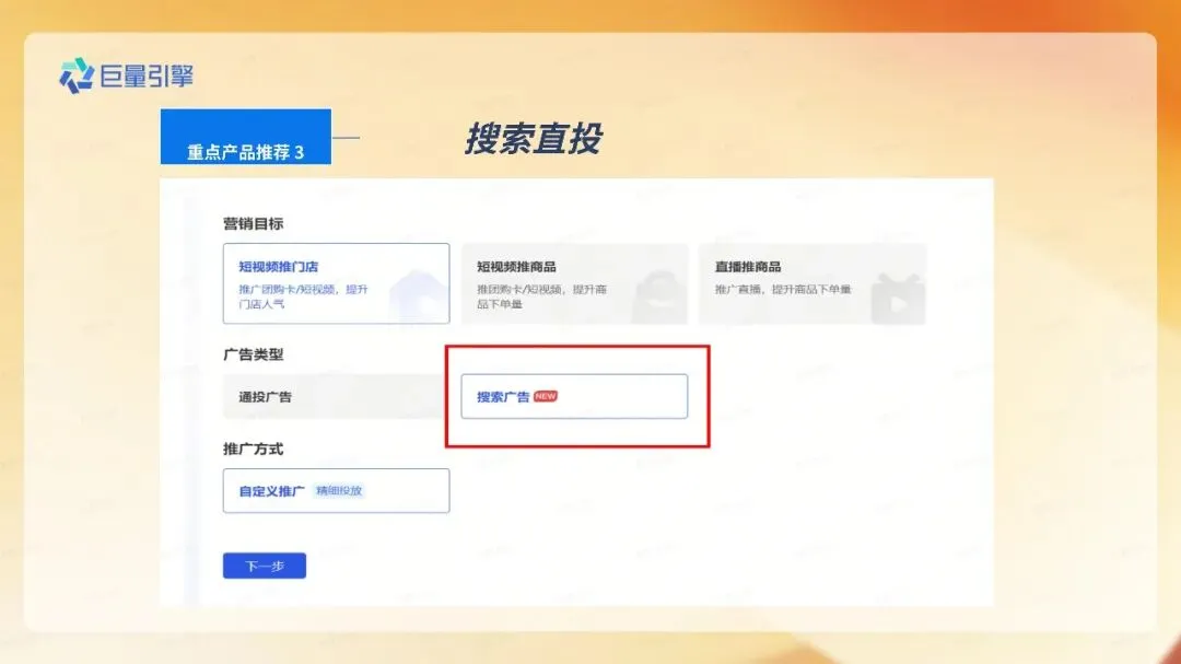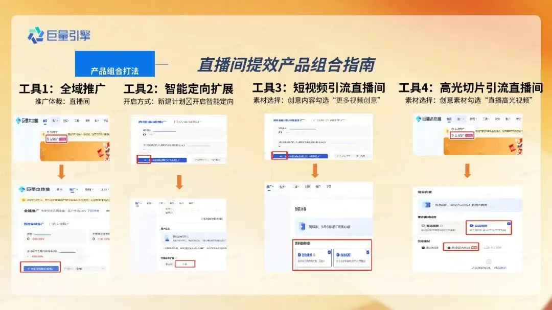 重点产品推荐包括:1)直播“全域推广”,以全域支付ROI为优化目标,最大化GMV,适用于大场冲刺与常态化经营;2)短视频“门店全域推广”,全托管模式探索全域流量,提升整体GMV;3)“搜索直投”,直接投放搜索广告,抢占搜索场景流量。