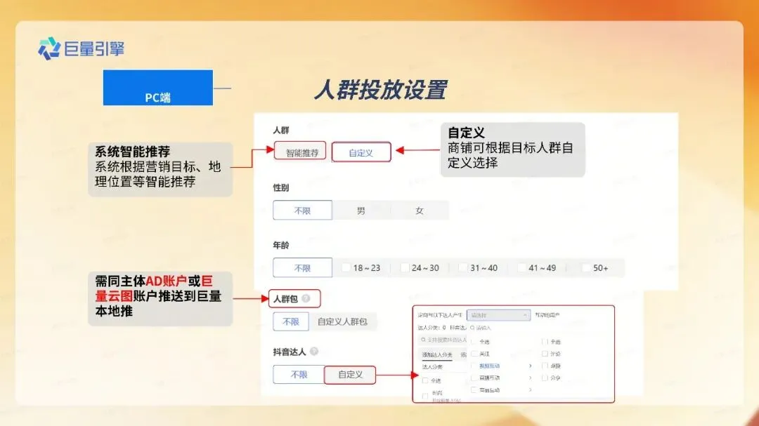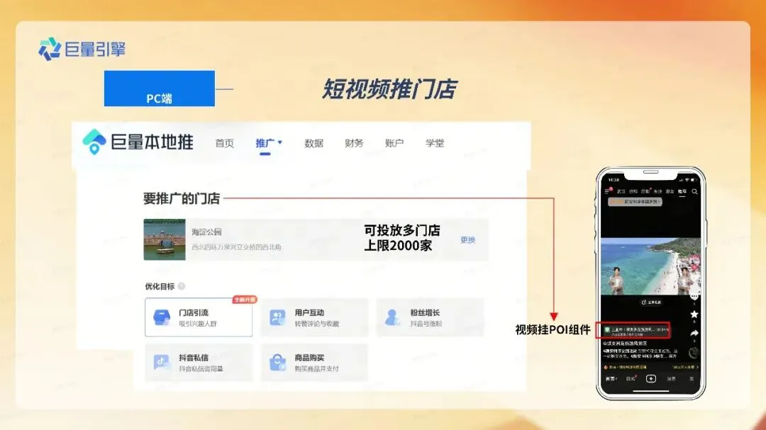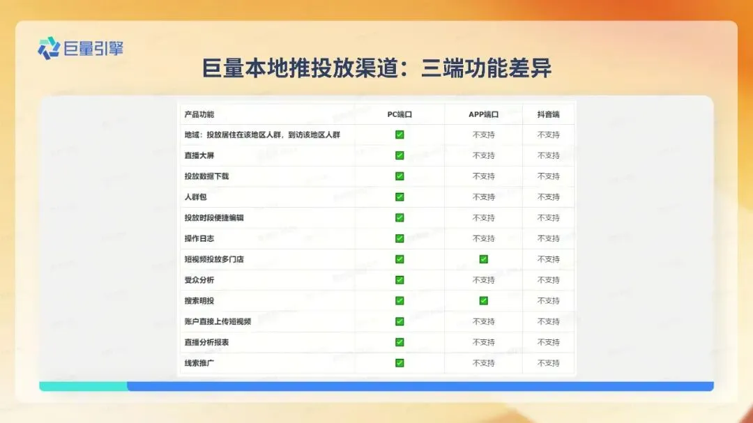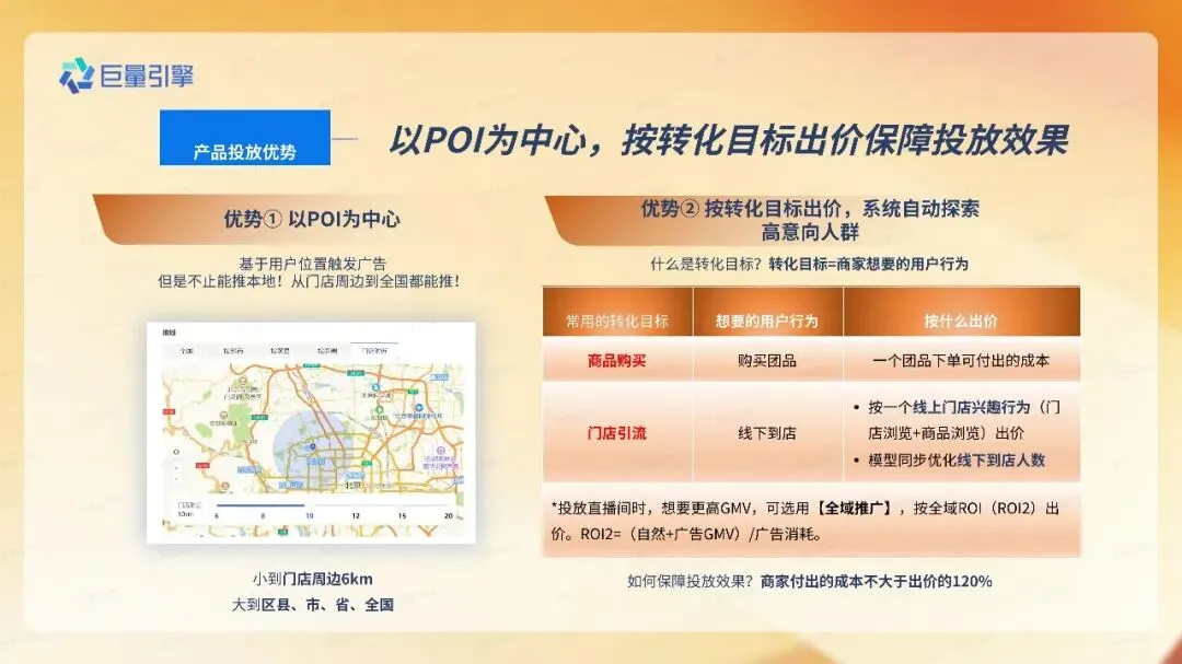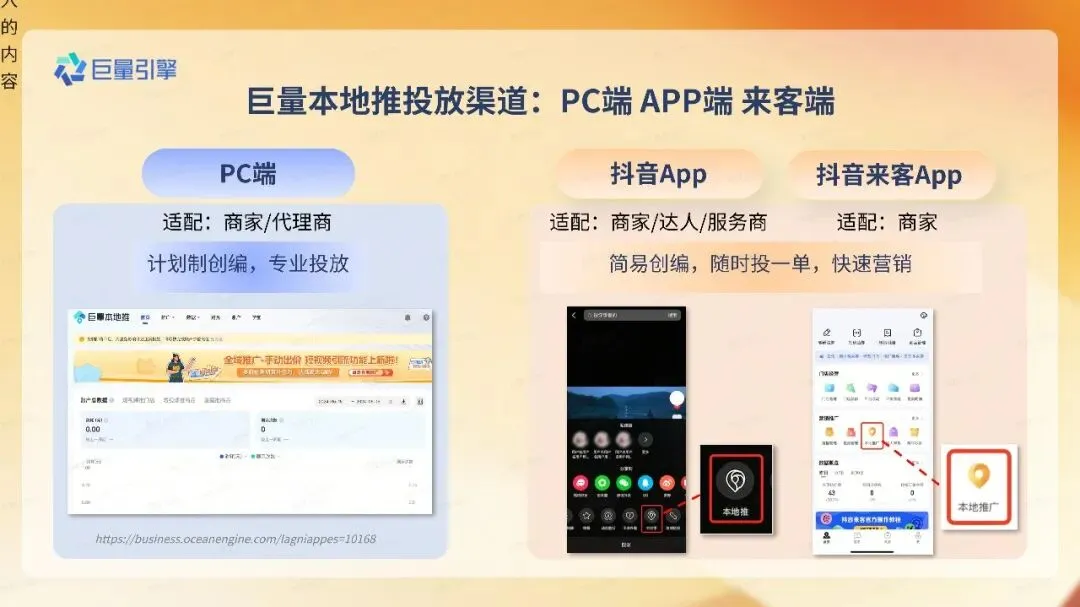 产品核心优势在于以POI为中心,支持从门店周边到全国的地域投放,并按转化目标出价保障效果。主要转化目标包括“门店引流”(优化线下到店)和“商品购买”(优化团品下单),系统按出价探索高意向人群,成本保障通常不高于出价的120%。投放渠道涵盖PC端(专业投放)、抖音App与抖音来客App(简易创投),三端功能存在差异,如人群包、数据下载等高级功能仅PC端支持。