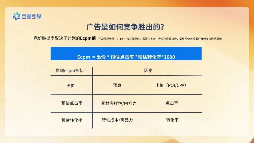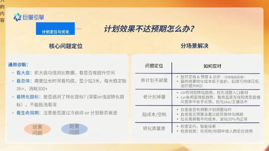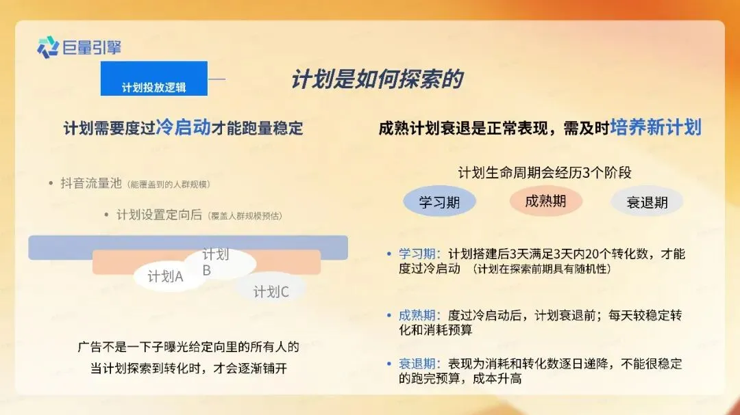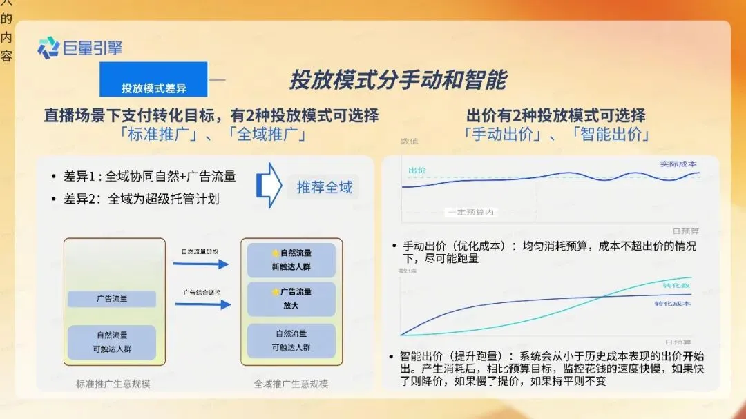 广告竞争胜出取决于Ecpm值(出价×预估点击率×预估转化率×1000)。计划生命周期分为学习期(需度过冷启动)、成熟期和衰退期。投放模式分为手动出价(成本可控)与智能出价(系统调价跑量);直播场景下还可选择“标准推广”或“全域推广”,后者通过协同自然与广告流量以提升整体GMV。