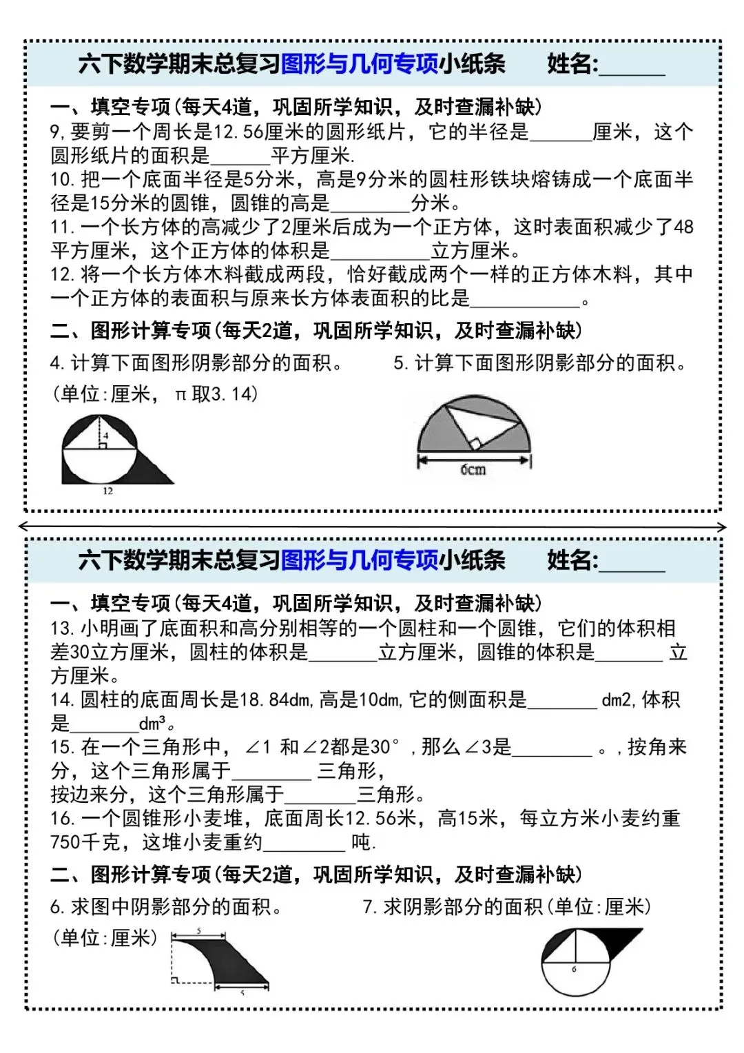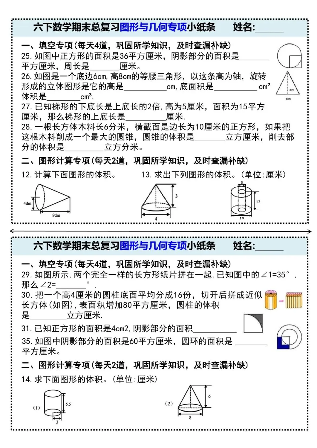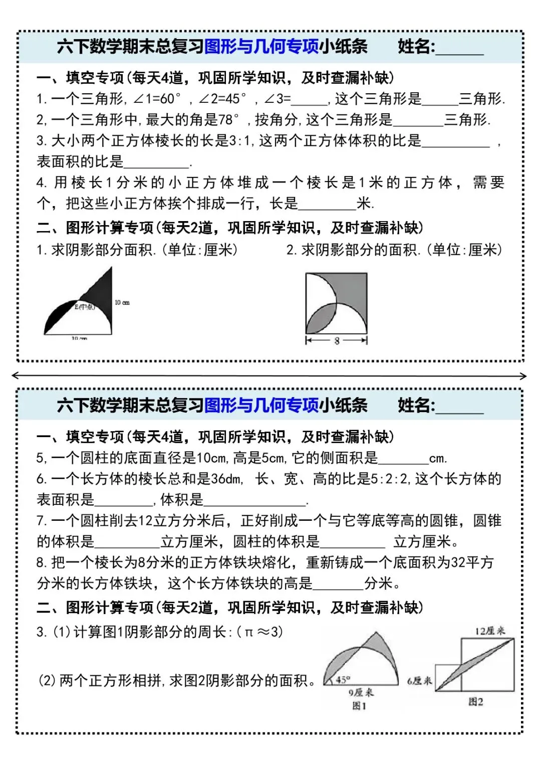 可下载丨26春六年级下册数学期末总复习图形与几何专项小纸条,电子版可打印