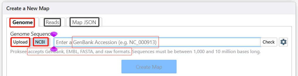 输入限制为最多1000万碱基 (10 million bases),或1GB测序读段文件。项目分为2种:会话项目 (临时存储,一周未活动后删除)和用户项目 (需账户登录,永久存储,支持跨设备访问)。