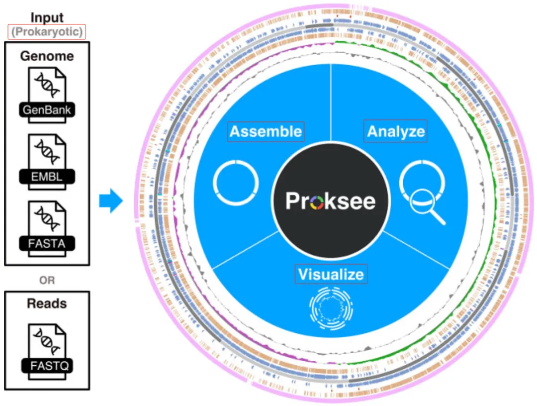 Proksee功能概览:输入 (原核生物)基因组或测序Reads,完成组装、分析和可视化
