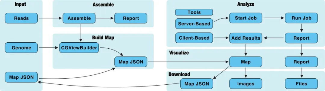 图1. Proksee工作流程. Genomes and reads (after being assembled) are converted into map JSON with the CGViewBuilder script. Map JSON is converted to a graphical map using CGView.js.