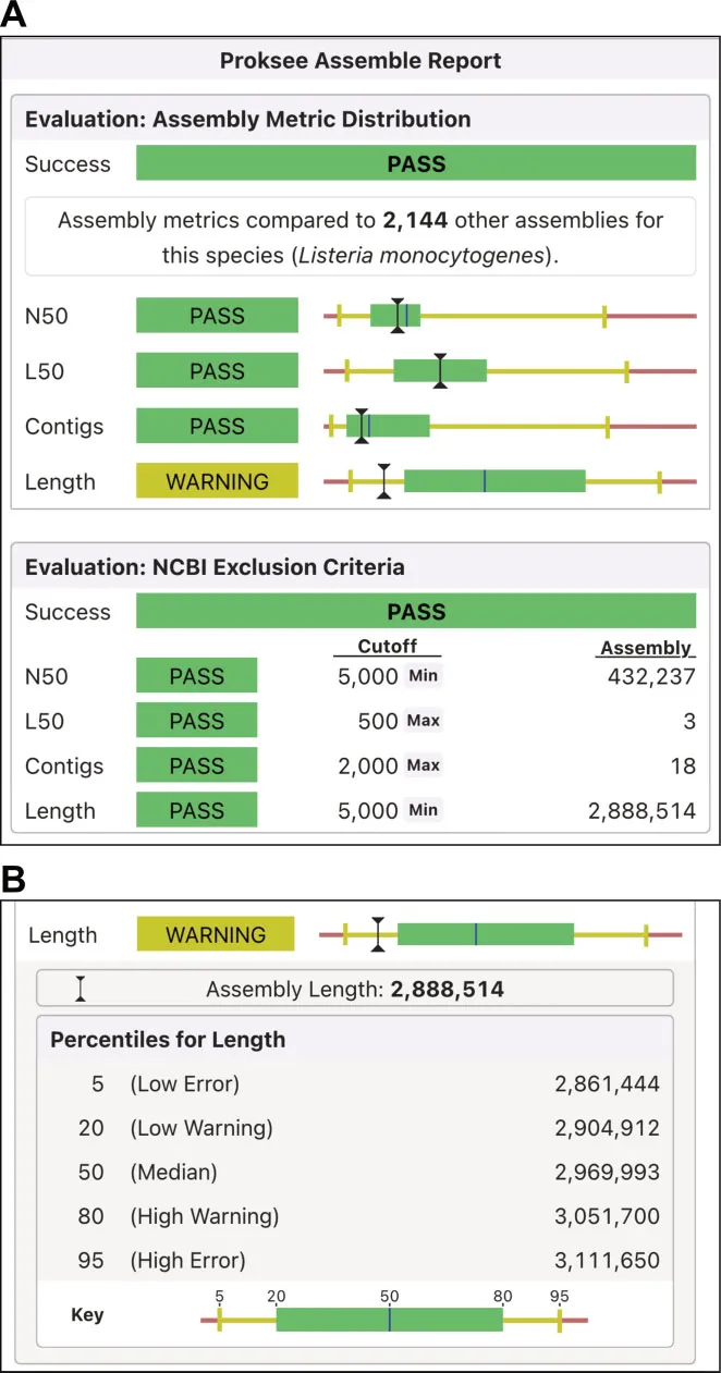 图2. 组装报告. (A) 上方:通过与Proksee自定义的参考数据库 (库中已有的特定物种的组装体)比较,显示对用户的组装体 (黑色竖线)的评估;下方:为NCBI的排除标准 (将组装体与NCBI参考序列排除标准比较). (B) 点击某个评估结果 (条形图)后,显示组装体评估值分布的细节。