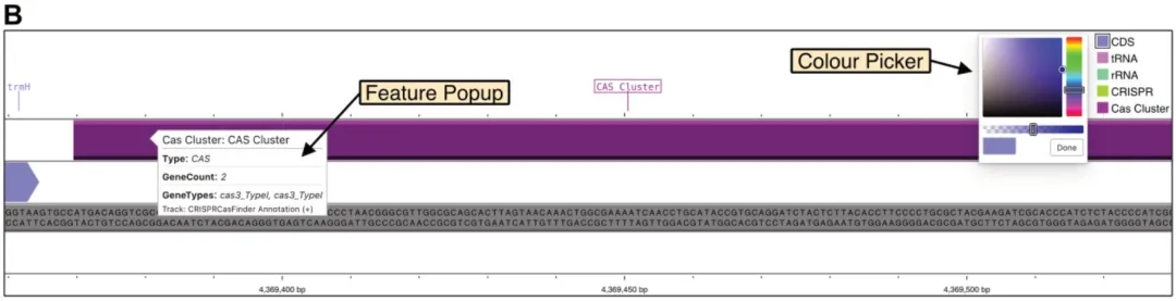 项目界面分为左侧标签页 (图谱视图-Map Tab、项目信息-About Tab、分析输出-Job tabs),及右侧侧边栏 (工具启动-Tools、图谱定制、作业监控–Jobs、结果下载–Data/Download),如下图3A。(右)侧边栏包含:显示面板 (Display Panel-自定义图谱内容与外观)、区域面板 (Regions Panel-管理Contig、特征、书签,搜索/选择/修改)和下载面板 (导出PNG/SVG图像、JSON存档文件)。