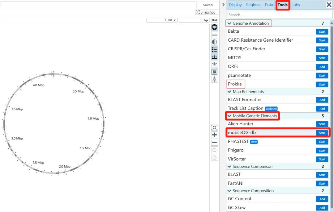 服务器工具(如Prokka、BLAST):在服务器上执行作业,完成后可查看并添加结果至图谱 (下图1)。