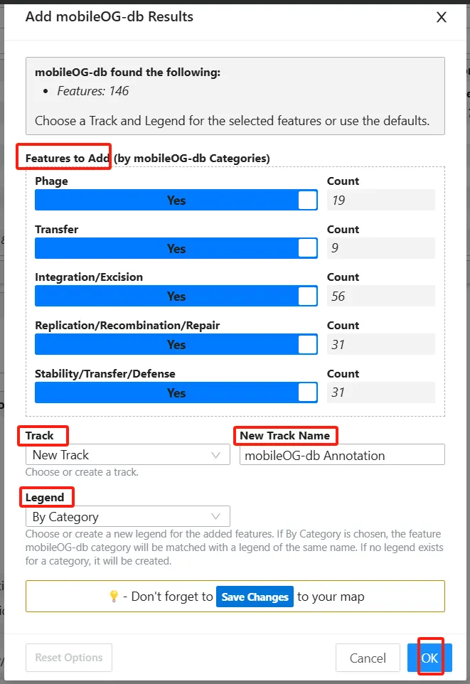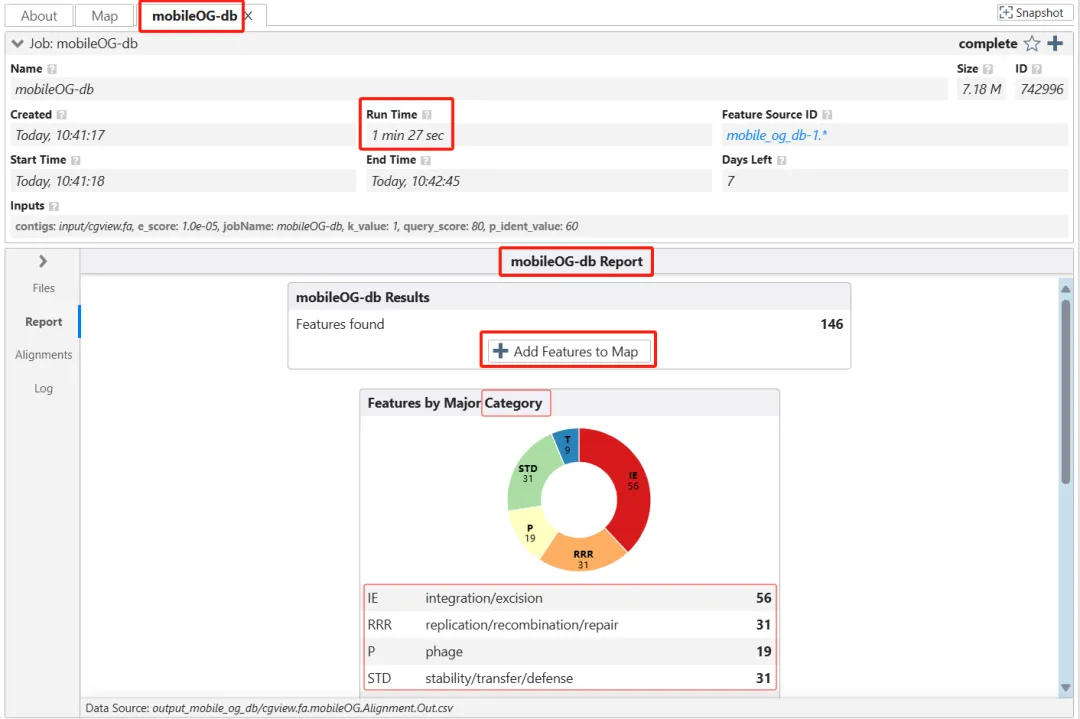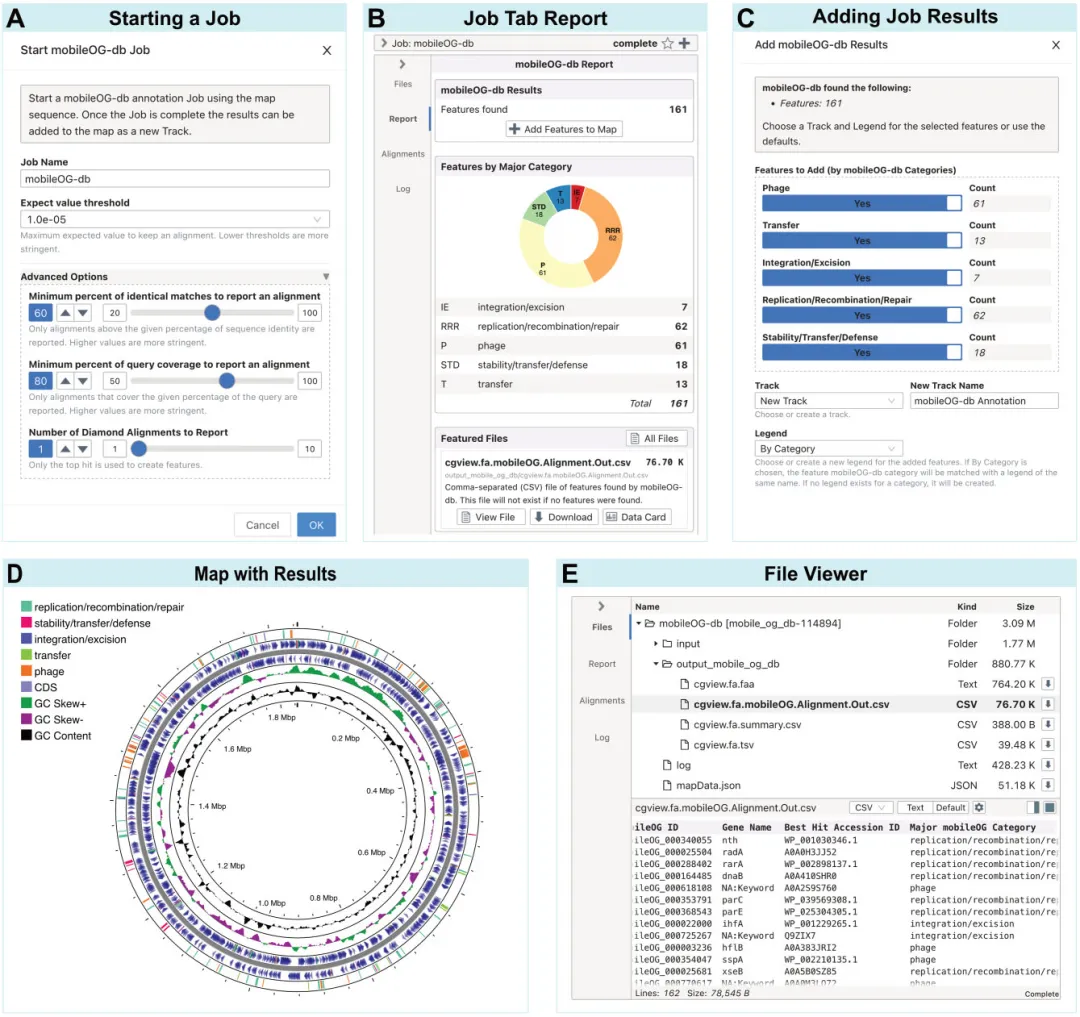 图4. 基于服务器的工具的工作流程。以mobileOG-db工具为例。(A) 启动基于服务器的工具,将显示“开始”对话框,其中可提供作业的名称,以及特定于不同工具的选项。(B) 已完成的作业将显示一张报告卡,其中包含所发现特征的摘要,以及一个将其添加到图谱的按钮 (加号)。该报告还包括一份特征文件列表 (即关键结果文件),并附有查看或下载每个文件的链接。(C) 添加对话框,用于将作业结果添加到图谱中,其中包含选择要添加哪些要素,以及为添加的要素使用哪些轨迹 (Track)和图例 (Legend)的选项。(D) 添加了特征与功能的图谱。显示的是从GenBank文件 (NZ CP007470)中提取的原始特征 (即CDS、tRNA、rRNA),mobileOG-db特征分为五类 (如:稳定性/转移/防御、复制/重组/修复、整合/切除、转移和噬菌体),以及GC Content和GC Skew工具的结果。(E) 文件卡显示此作业的输入和输出文件的文件树 (顶部),和其中一个输出文件的文档查看器 (底部)。