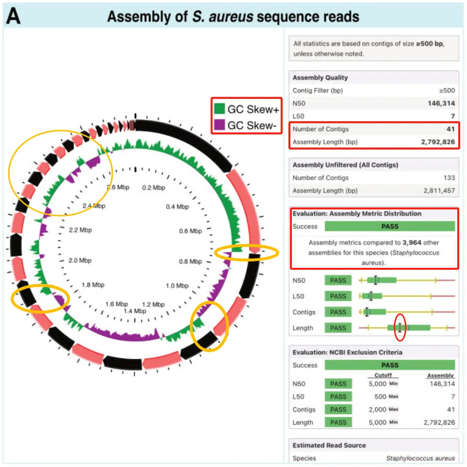A.金黄葡萄球菌读段组装 (图5A):组装结果显示Contig边界与GC Skew突然变化 (Abrupt changes)关联 (Coincide),提示组装不完整。