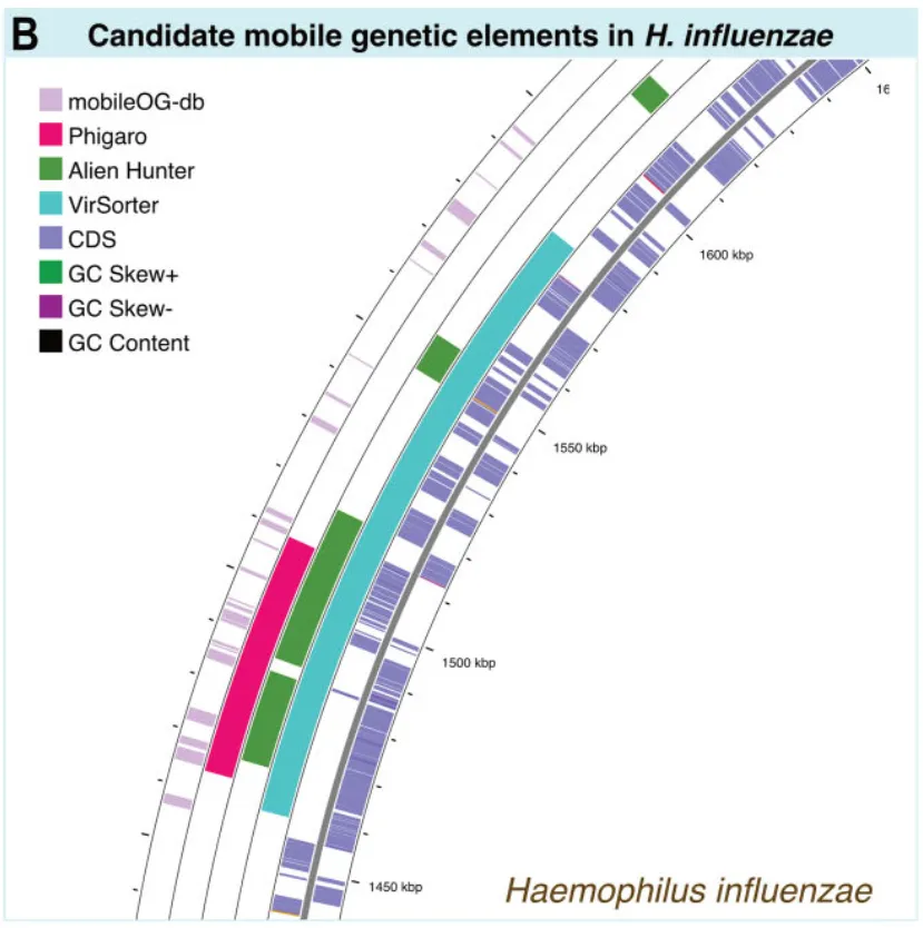 B.流感嗜血杆菌移动遗传元件鉴定 (图5B):通过VirSorter、mobileOG-db等工具识别共有区域。
