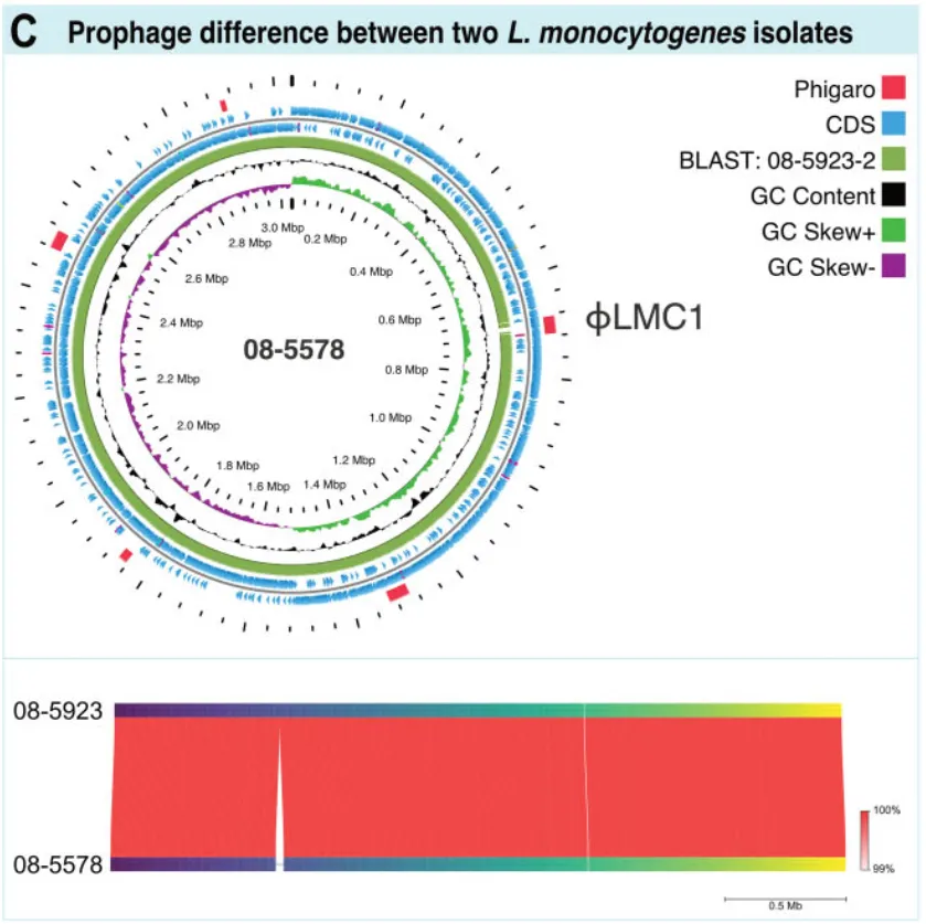 C.单核细胞增生李斯特菌临床分离株前噬菌体差异 (图5C):BLAST和FastANI比较揭示菌株间前噬菌体φLMC1的存在差异。