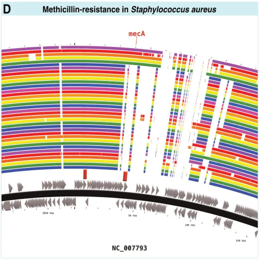 D.金黄色葡萄球菌甲氧西林耐药基因分析 (图5D):CARD/RGI识别mecA基因,BLAST比较36个相关基因组。