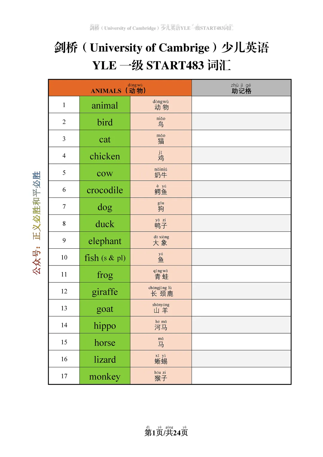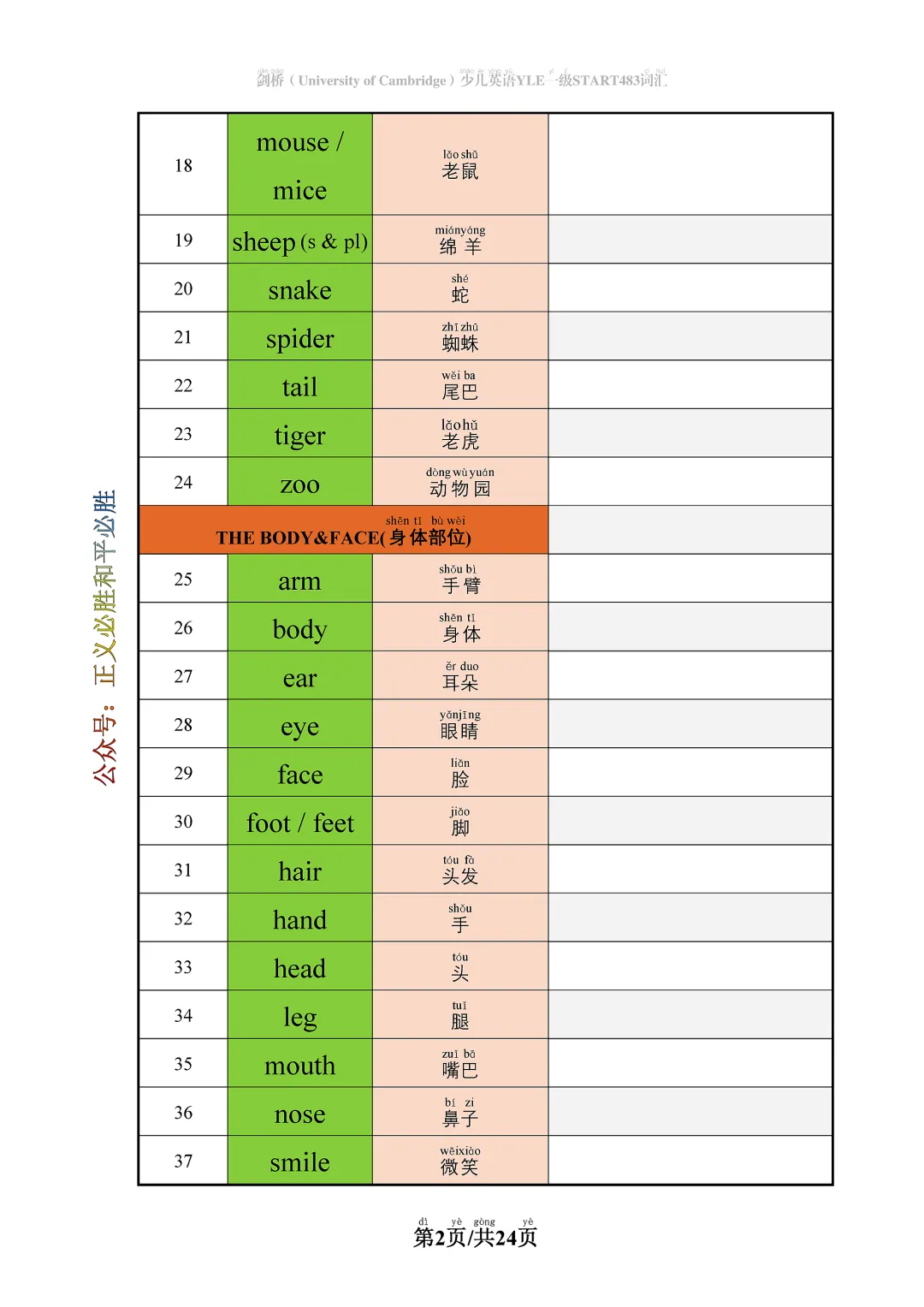 最近后台好多一二年级的家长跟我吐槽,说陪孩子学英语真的太费爸妈了:刚上小学的娃,刚学了拼音,还认不全汉字,拿着单词表来问我:“妈妈,这个字念什么?这个单词是什么意思?”我上班累了一天,还要一个字一个字给孩子念,念完一页,嗓子都哑了,结果孩子还记不住,第二天就忘光了。更头疼的是,自己上学的时候英语就不好,单词发音模模糊糊的,根本不敢教,怕把孩子的发音带偏了,以后改都改不过来。是不是你也有过这样的困扰?其实,低龄孩子学英语,最需要的就是一个能让他自己学的工具,不用家长陪着,不用家长念,孩子自己就能看懂,自己就能读,自己就能背。今天我就给大家整理了这份剑桥少儿英语YLE一级拼音单词表,专门给一二年级的孩子做的,真的太省心了!这份单词表,整理了剑桥少儿英语一级要求掌握的 483 个核心词汇,都是一二年级孩子必须要会的单词,涵盖了日常的食物、动物、家、学校、玩具、时间等等所有常用的主题,孩子学完这些,英语的基础就完全打牢了,不管是学校的考试,还是以后考YLE,都完全够用。最贴心的是,我把所有的中文释义,每个字都标了拼音!孩子刚学了拼音,就算不认字,自己拿着表,用拼音就能拼出中文的意思,不用家长一遍一遍给念,自己就能看懂每个单词是什么意思,自己就能读,自己就能背!家长完全可以放手,孩子自己就能完成单词的学习,真的太省妈了!而且这个表排版很清晰,字也很大,孩子看着不累,打印出来装订好,就是一本小小的单词小册子,平时出门带着也方便,等车的时候、吃饭前,都能拿出来读几个单词,碎片时间就能把单词背了。话不多说,先给大家放个完整的预览,大家可以看看:怎么样,是不是很实用?如果这份资料对你有帮助,别忘了点个赞、在看,转发给身边同样有需要的一二年级家长,让更多孩子能轻松搞定英语启蒙,让更多咱们当家长的,能少点陪读的压力!另外,完整的 PDF 打印版,我已经给大家整理好了,打印出来给孩子用,比看手机方便多了。👉大家关注公众号【正义必胜和平必胜】回复【剑桥少儿英语】,即可获得原版高清无水印PDF文档。