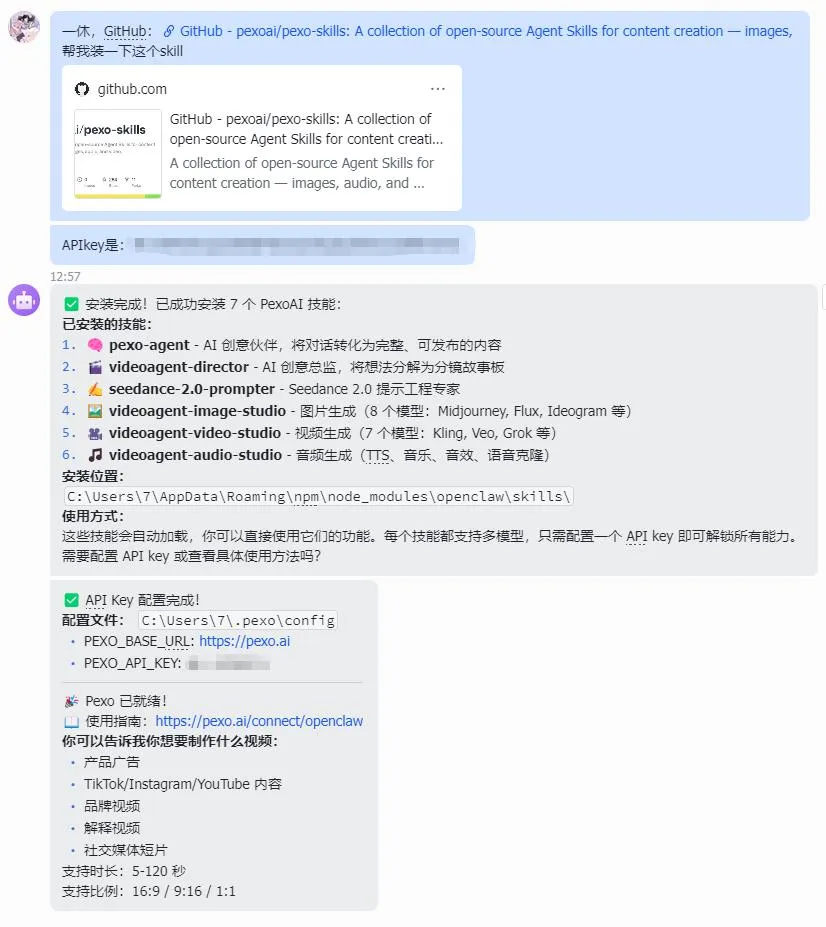 3️⃣ 把 GitHub 链接发给一休管家 → 自动安装技能