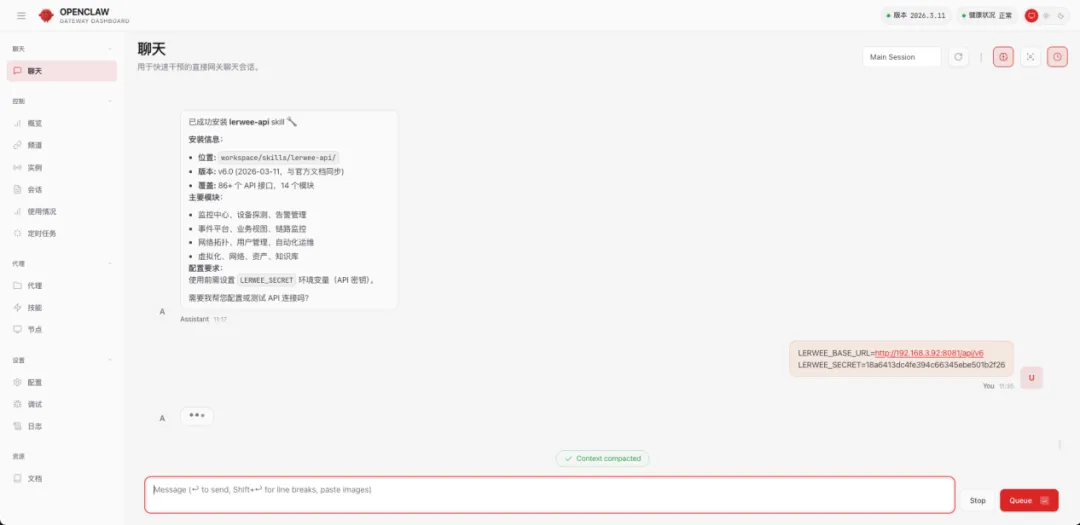 场景描述:Lerwee API Skill适用于Openclaw对接Lerwee运维智能体,通过 API对接,将监控、指标、告警、CMDB 等运维数据汇聚一起,让 Openclaw 能够顺畅对接 Lerwee 运维智能体的全栈能力。