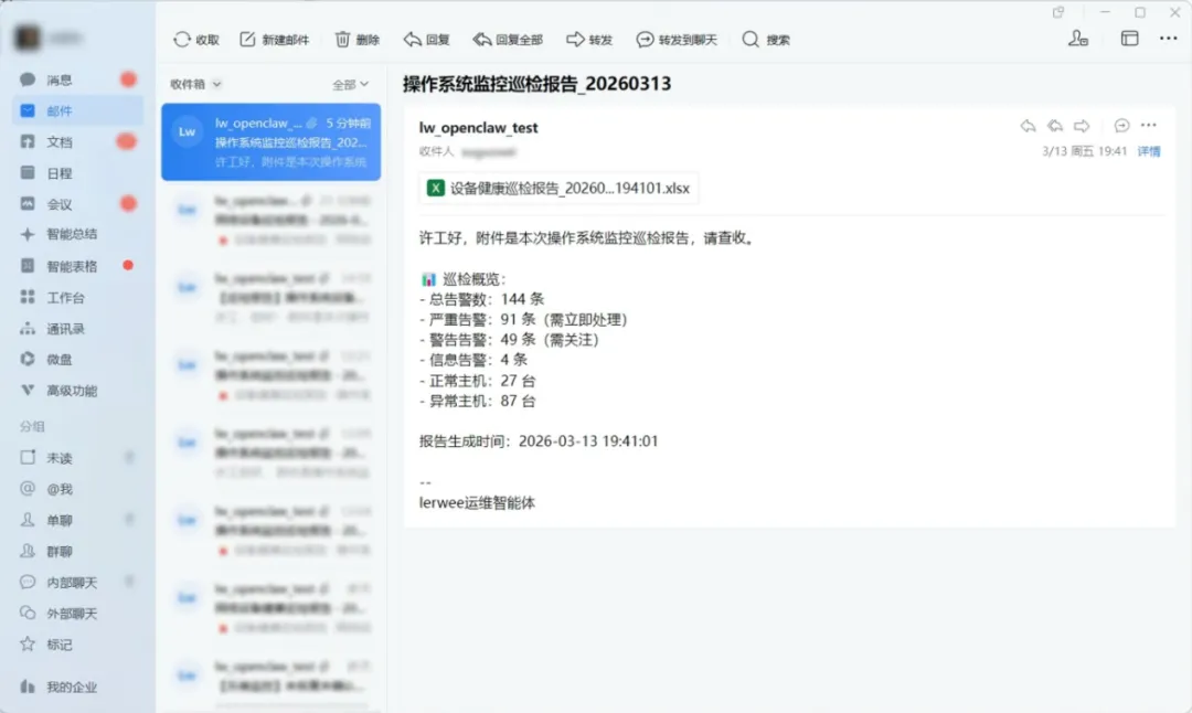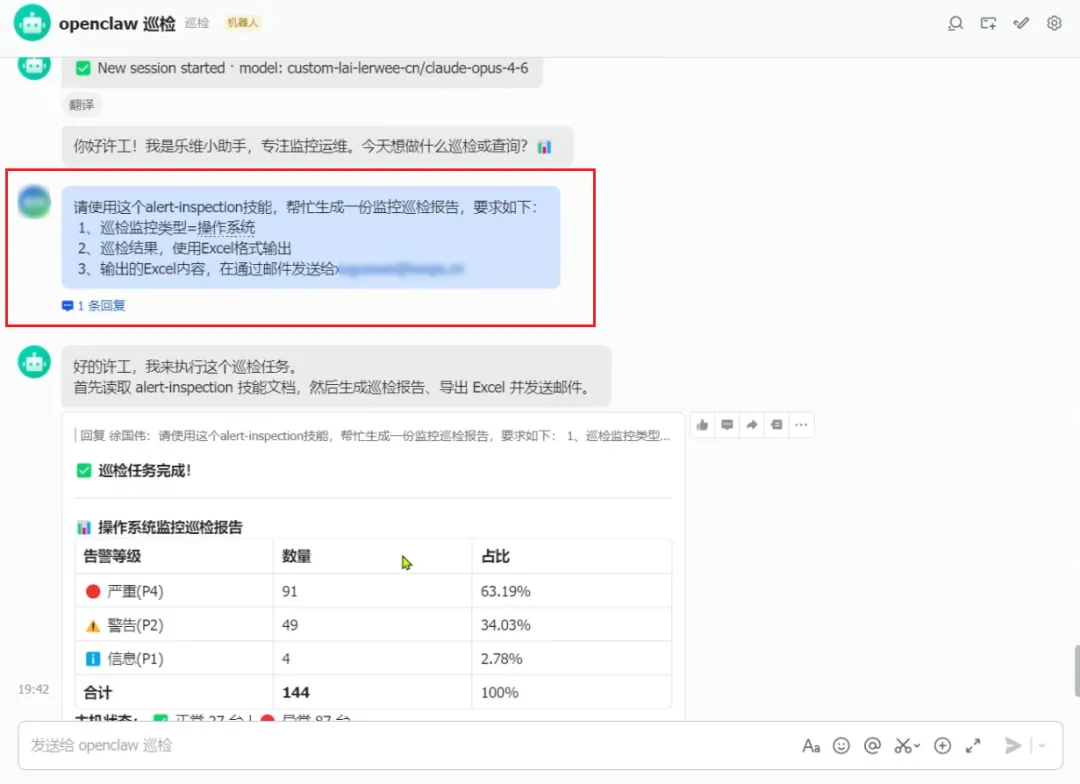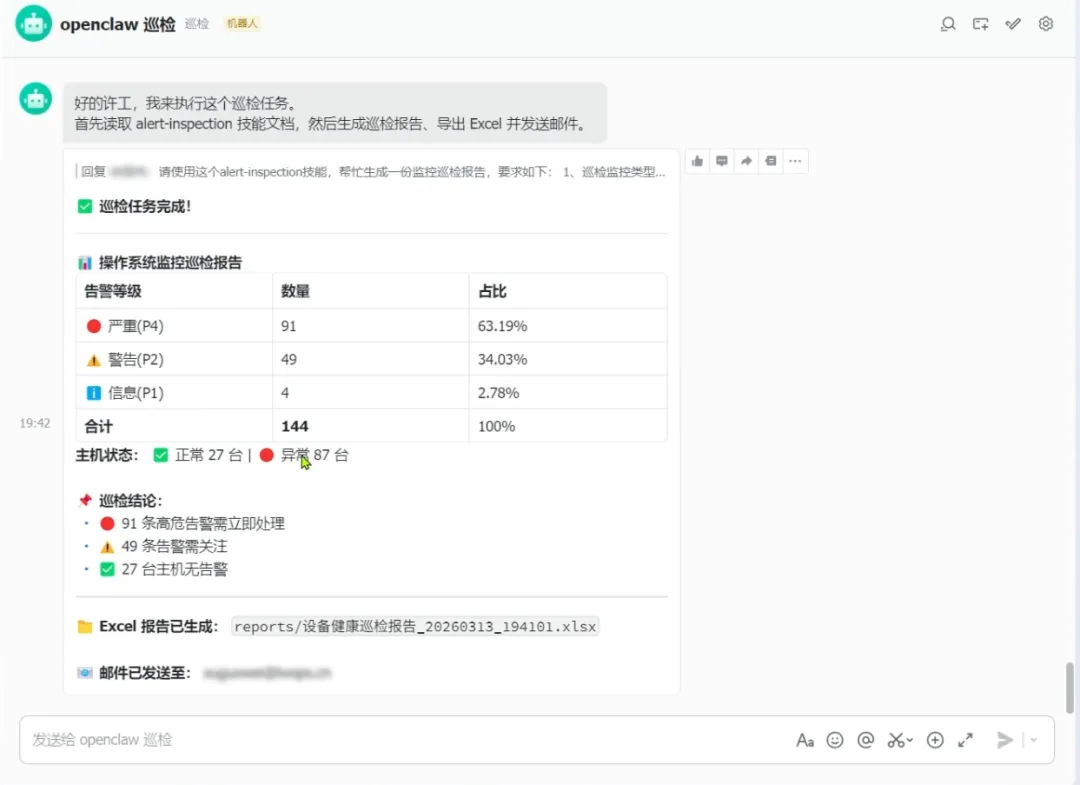 场景描述:该Skill的核心适配场景为设备健康巡检、告警审查与巡检报告生成(Markdown 格式)等,同时支持告警数据导出为 Excel与发送邮箱,全程无需人工干预,实现了巡检工作的全自动化,解决人工运维巡检耗时耗力且容易出现遗漏等问题。