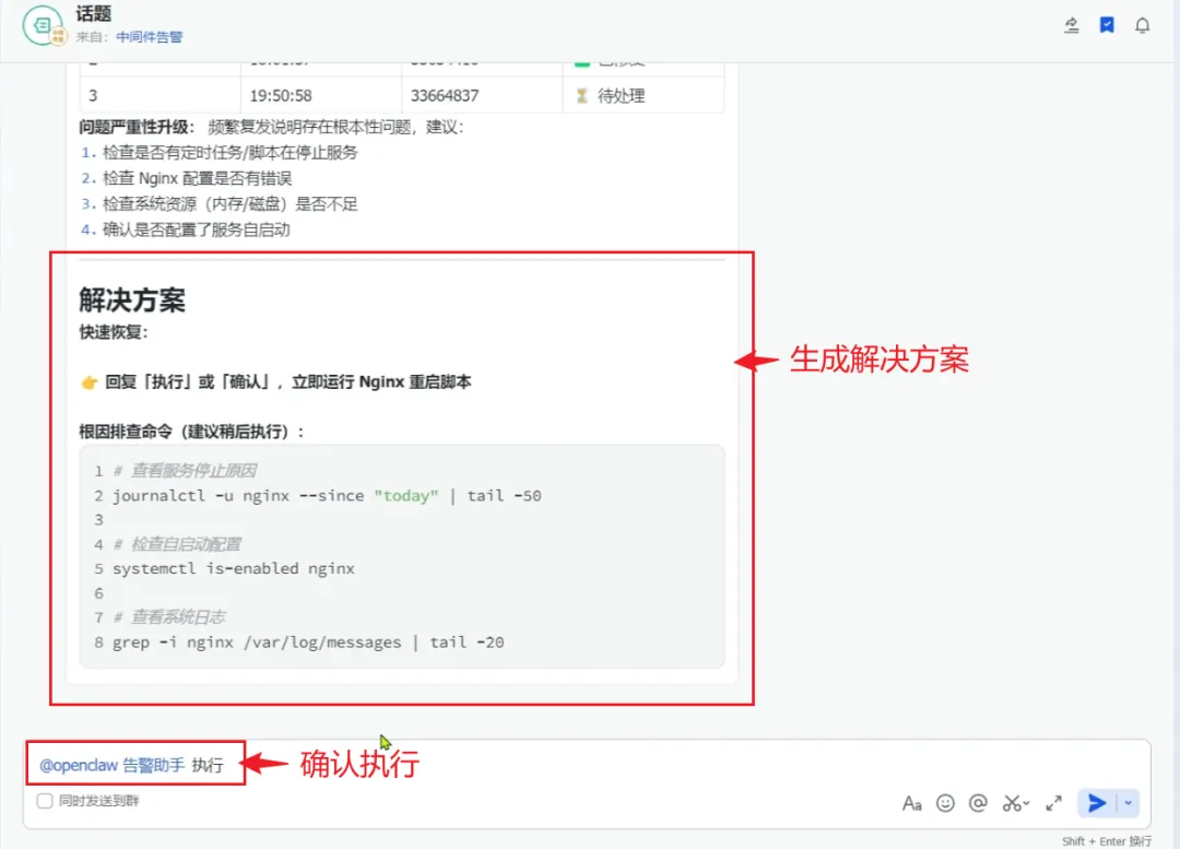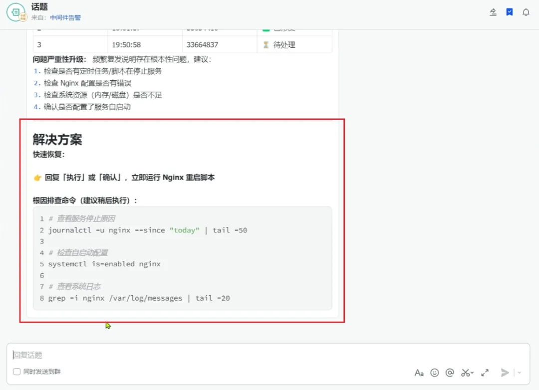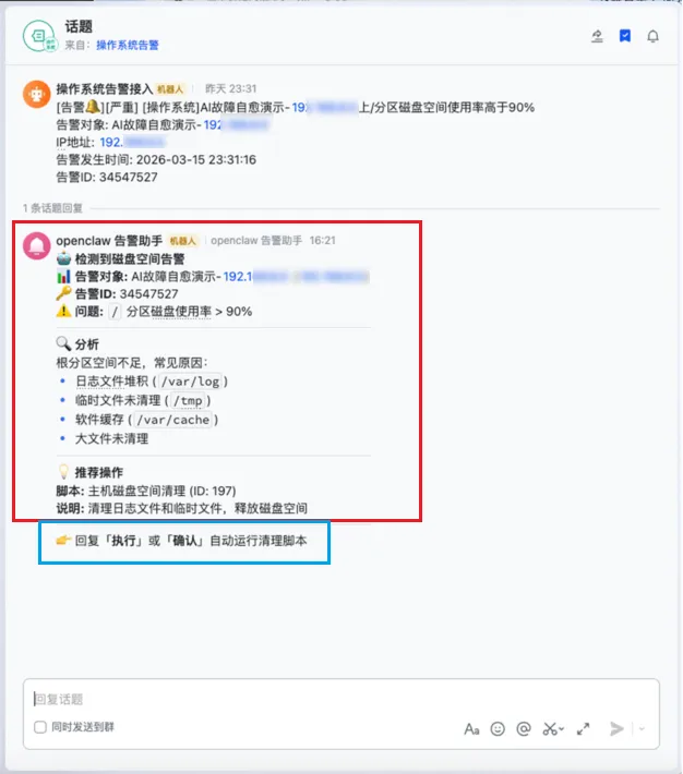 场景描述:该Skill的核心适配场景为告警自动处理。围绕告警全生命周期,打通了“告警 – 分析 – 处理 – 恢复” 的链路,将原本分散的告警监控、故障分析、脚本执行环节整合为一个有机整体,实现了从告警提醒到故障恢复的全流程自动化,打造了告警管理的闭环体系。