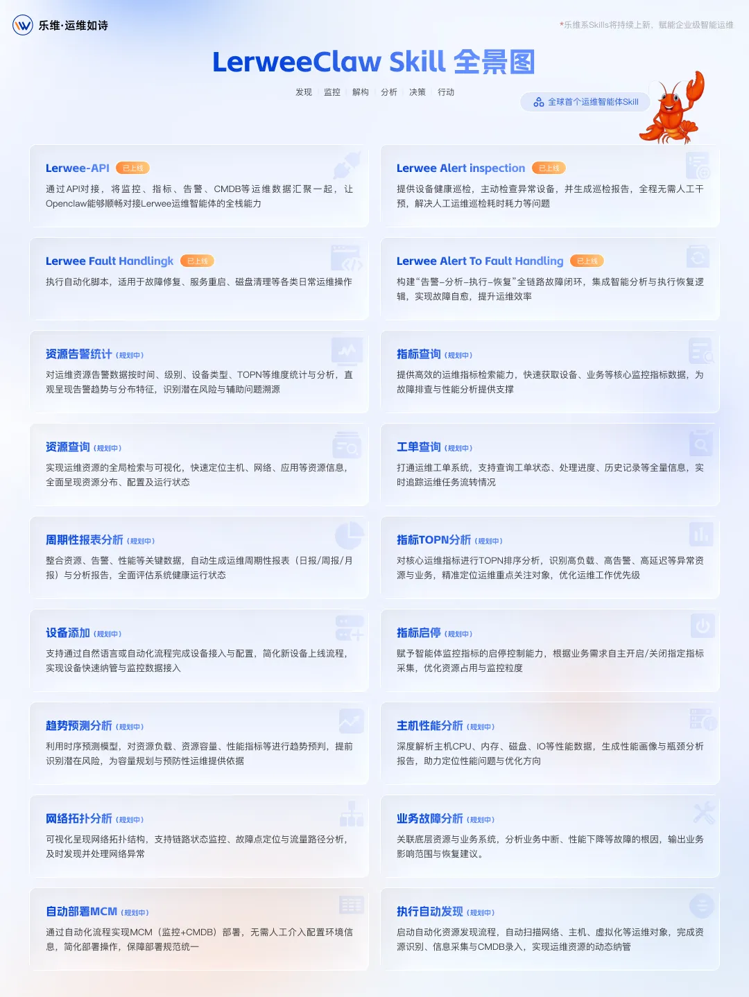 目前,乐维已在OpenClaw已经上线多个运维 Skill,部署 Lerwee 运维智能体 + OpenClaw ,下载配套 Skill,即可直接使用。