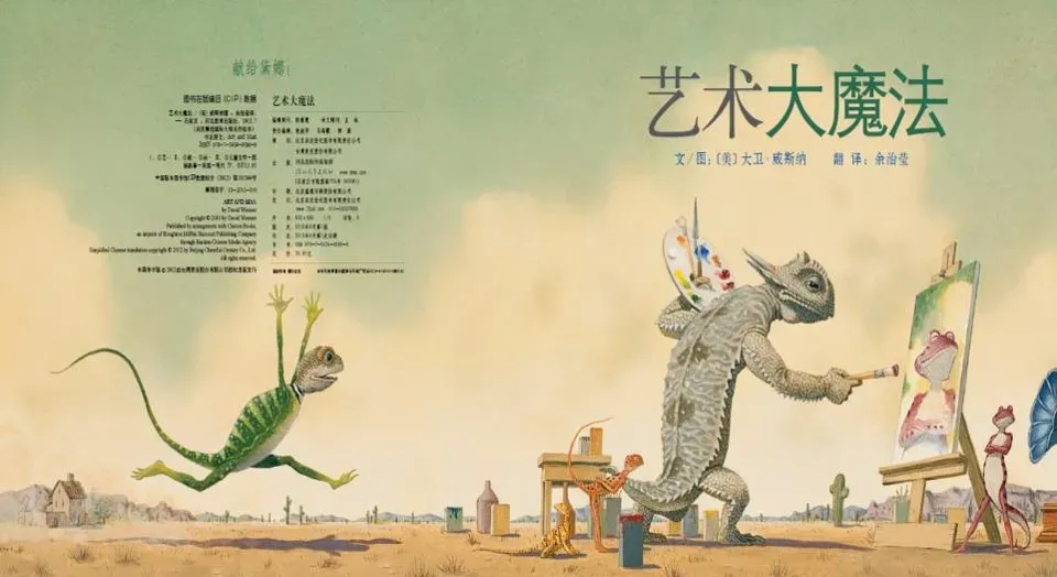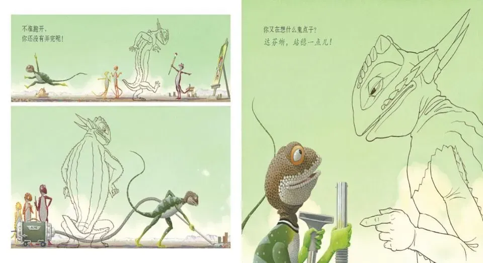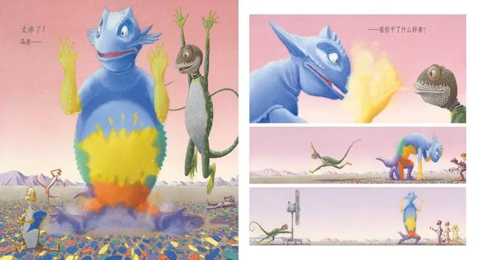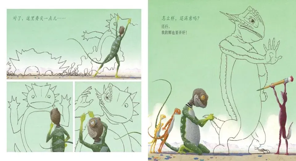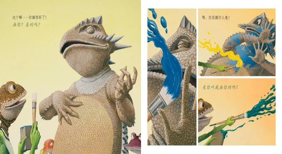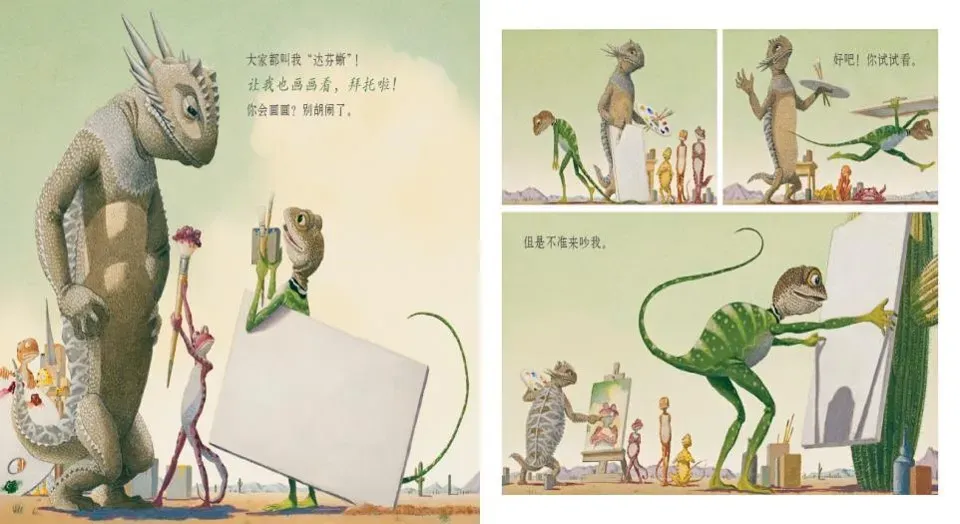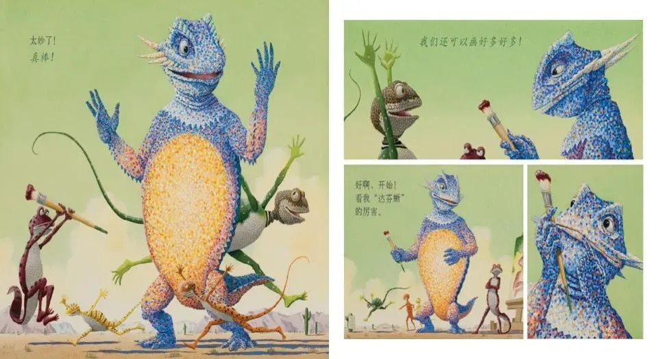 《艺术大魔法》讲述的是一个画家和想成为画家的人探索艺术极限的故事,他们在画画的过程中尝试了很多种可能,使得画出来的图画跟以往都大不相同,也使得我们明白创意无处不在没有极限。同时,这本书的作者也是一个材料大师,在本书中玩转了多种绘画素材,一开始,达分蜥是一只水粉蜥,后来变成了彩虹蜥、水彩蜥、白描蜥……随着线条重组,变成了儿童简笔画、形象的具体画,马蒂拿吸尘器吸了所有的彩色盔甲喷出了米罗,当颜色又回到达分蜥身上时,它变成了西涅克。达分蜥经历了一次小蜥蜴从丙烯、蜡笔、水彩、水墨、线条、点彩的天马行空的艺术创作,看似疯狂,但却是一次很好的艺术启蒙。
