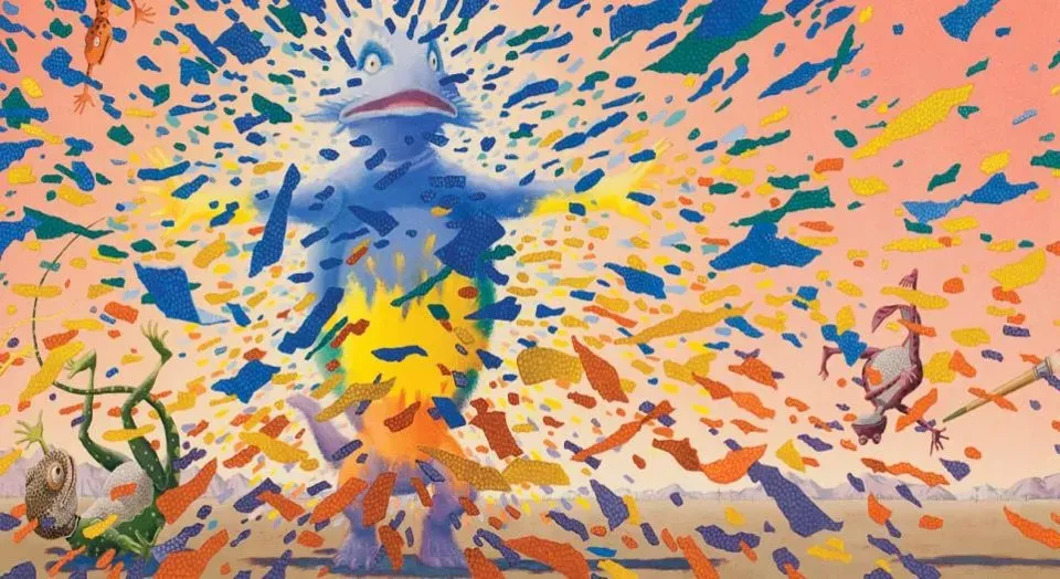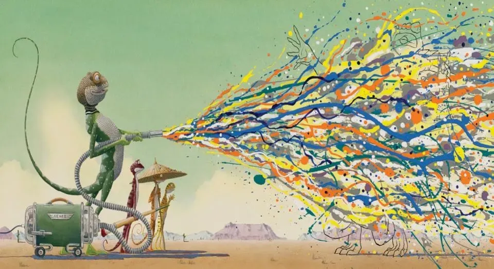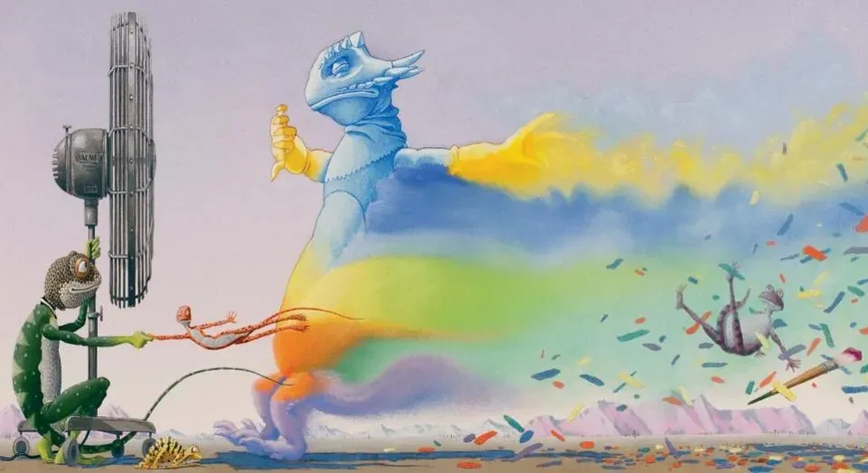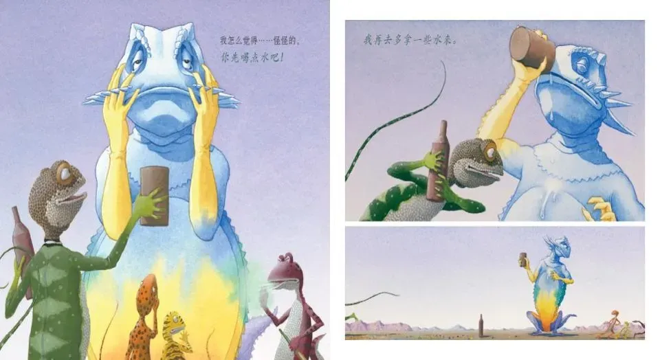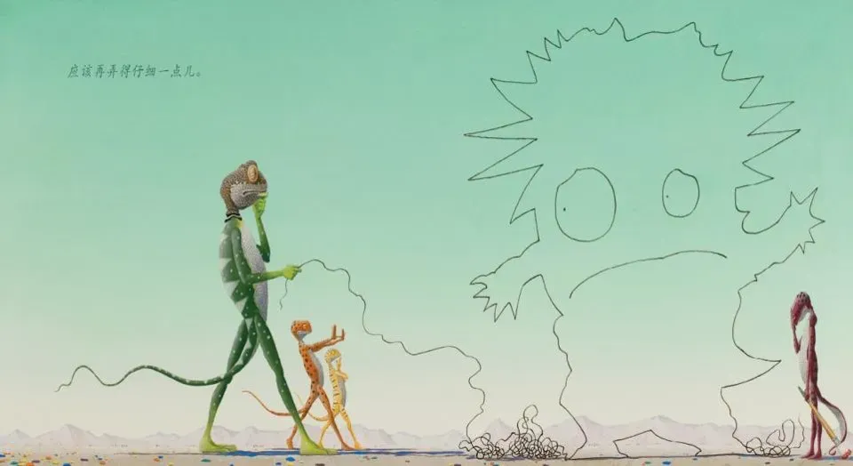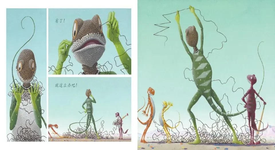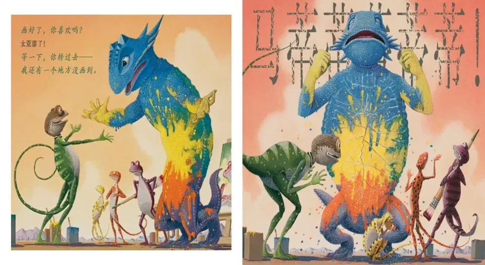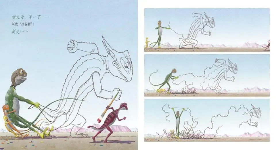 《艺术大魔法》讲述的是一个画家和想成为画家的人探索艺术极限的故事,他们在画画的过程中尝试了很多种可能,使得画出来的图画跟以往都大不相同,也使得我们明白创意无处不在没有极限。同时,这本书的作者也是一个材料大师,在本书中玩转了多种绘画素材,一开始,达分蜥是一只水粉蜥,后来变成了彩虹蜥、水彩蜥、白描蜥……随着线条重组,变成了儿童简笔画、形象的具体画,马蒂拿吸尘器吸了所有的彩色盔甲喷出了米罗,当颜色又回到达分蜥身上时,它变成了西涅克。达分蜥经历了一次小蜥蜴从丙烯、蜡笔、水彩、水墨、线条、点彩的天马行空的艺术创作,看似疯狂,但却是一次很好的艺术启蒙。
