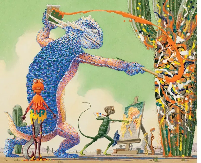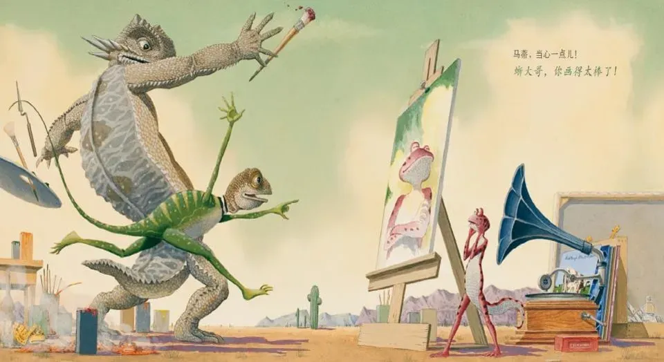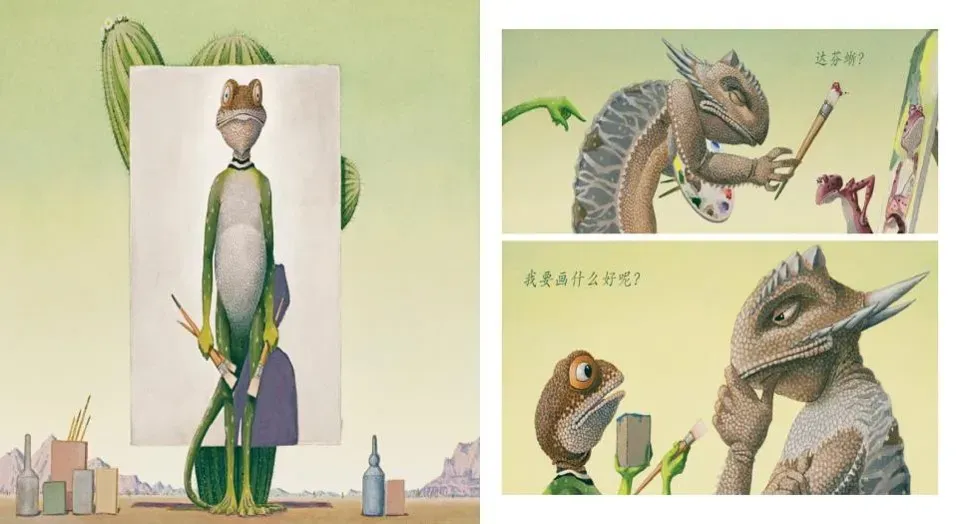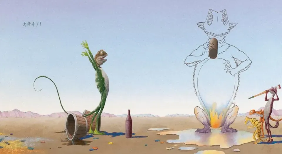 谁才是真正的艺术家呢。画家去画真实的人物,小蜥蜴呢?随意涂鸦,随意创作,不是用笔一笔一画的刻画,随心所欲的去创作,是不是跟家里的小朋友一样呢?