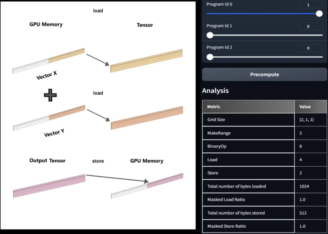 GPU 编程是人工智能系统的关键部分,学习比较困难,需要理解大规模并行、内存层级的数据移动 等相关知识。Triton-Viz 提供了 GPU运算的可视化交互,包括并行、访存、性能指标。