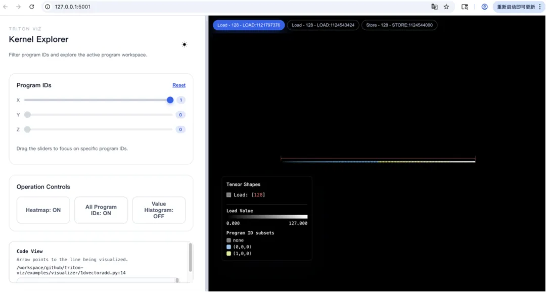 import tritonimport triton.language as tlimport torchimport triton_viz@triton_viz.trace("tracer")@triton.jitdef add_kernel(x_ptr, y_ptr, z_ptr, N, B: tl.constexpr):pid = tl.program_id(0)offsets = tl.arange(0, B) + pid * Bmask = offsets < Nx = tl.load(x_ptr + offsets, mask=mask)y = tl.load(y_ptr + offsets, mask=mask)z = x + ytl.store(z_ptr + offsets, z, mask=mask)N = 128BLOCK_SIZE = 64num_blocks = triton.cdiv(N, BLOCK_SIZE)x = torch.arange(N, dtype=torch.float32)y = torch.arange(N, dtype=torch.float32)z = torch.zeros(N, dtype=torch.float32)add_kernel[(num_blocks,)](x, y, z, N, BLOCK_SIZE)triton_viz.launch(share=False, port=5001)