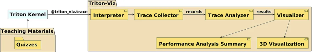 Triton-Viz 由 4部分组成,interpreter, Trace Collector, Trace Analyzer, Visualizer,如下图所示。interpreter 拦截 Triton Kernel 把它暴露给 callback。Trace Collector 设置 callbacks,functions 记录了tensors 或 scalars 的实际值。这些值会提供给 Trace Analyzer 分析访存和性能指标。最后 Visualizer 交互显示 trace data。interpreter 使用 numpy 函数在 CPU 上执行 Triton Kernel,不进行编译。