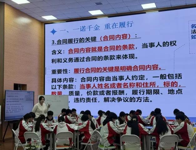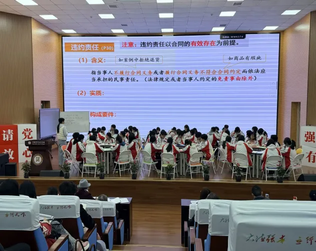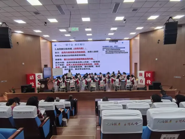 在同课异构教学展示环节,三位教师围绕“有约必守,违约必责”这一课题,呈现了三节风格各异、各具匠心的精彩课堂。