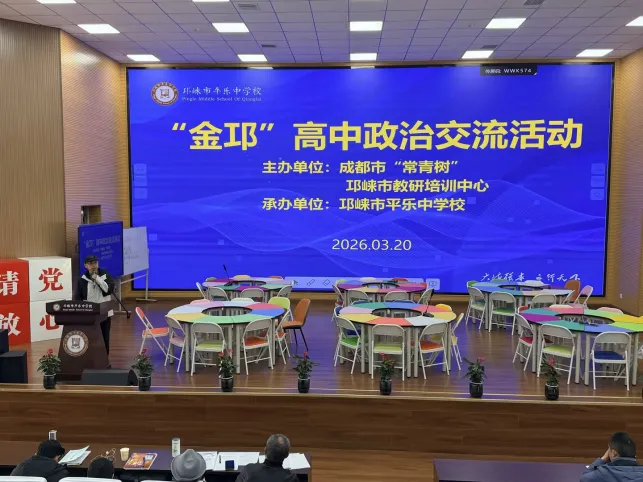 2026年3月20日,“金邛”高中政治交流活动在邛崃市平乐中学校顺利举行。本次活动由成都市“常青树计划”工作室、邛崃市教研培训中心主办,邛崃市平乐中学校承办。成都市“常青树计划”导师高守良、邱兴建,邛崃市政治教研员陈刚老师,全市高中政治中心组成员及各校政治教师代表参加了此次活动。活动由高二备课组长马晓英老师主持,围绕同课异构教学展示、专题讲座、评课总结三个环节有序展开。三位授课教师分别为:邛崃市平乐中学植材华老师、邛崃二中寇雪老师、成都二十中张淑林老师,她们在议题式教学设计与课堂实施方面各有专长,呈现了三节高质量的研讨课。