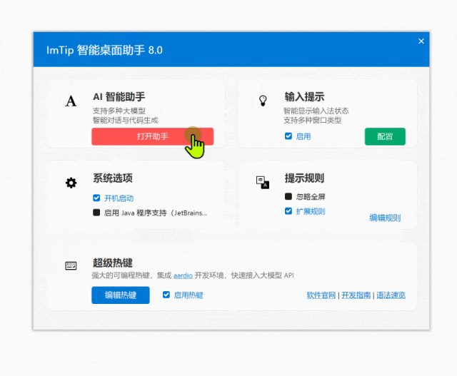 除了输入法状态提示外,imTip和AI的结合也很给力,在软件后台配置好AI接口后,可以在桌面快捷启动桌面助手直接向AI提问,不用再繁琐地打开各个AI网站。