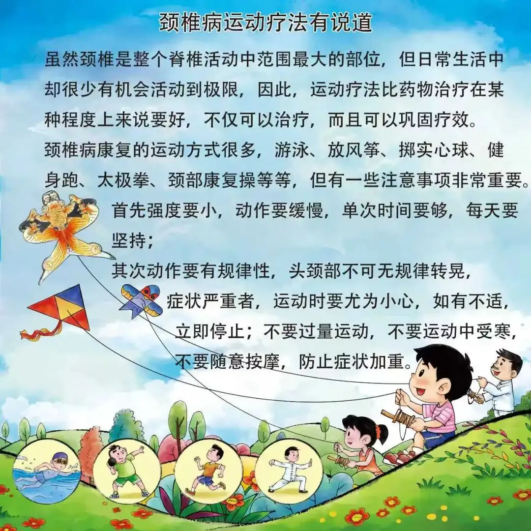 虽然颈椎是整个脊椎活动中范围最大的部位,但日常生活中却很少有机会活动到极限,因此,运动疗法比药物治疗在某种程度上来说要好,不仅可以治疗,而且可以巩固疗效。颈椎病康复的运动方式很多,游泳、放风筝、掷实心球、健身跑、太极拳、颈部康复操等等,但有一些注意事项非常重要。首先强度要小,动作要缓慢,单次时间要够,每天要坚持;