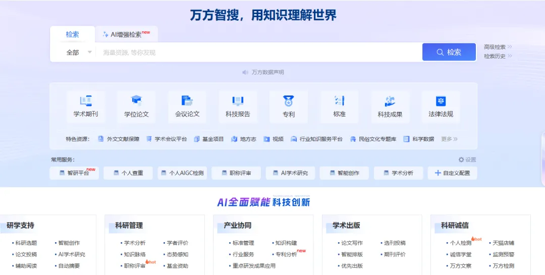 该平台集成了包括学术期刊、学位论文、会议文献、专利、标准、科技成果、法律法规、地方志、视频等多种资源类型,并提供了知识脉络分析、ai增强检索等多元化的增值服务,以支持科研人员、学者、学生及各类机构用户的学术研究、技术创新与知识管理需求。