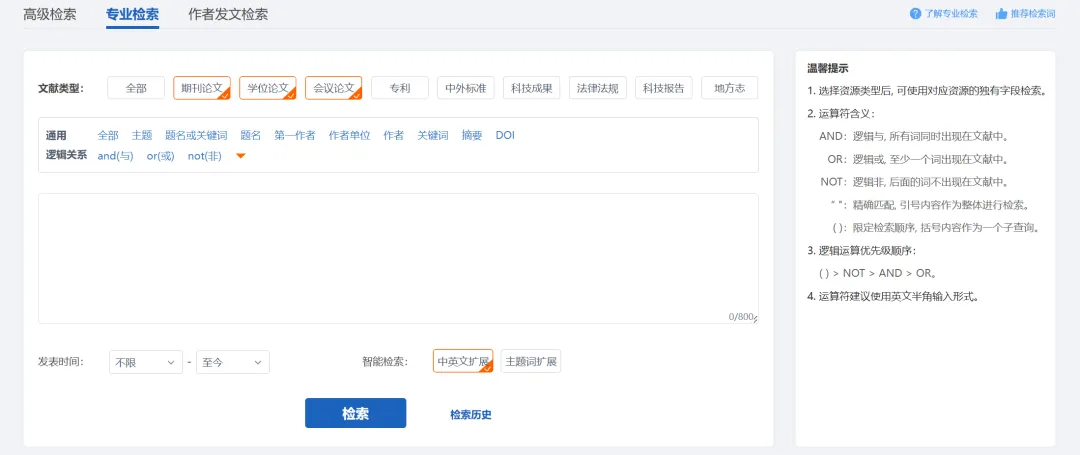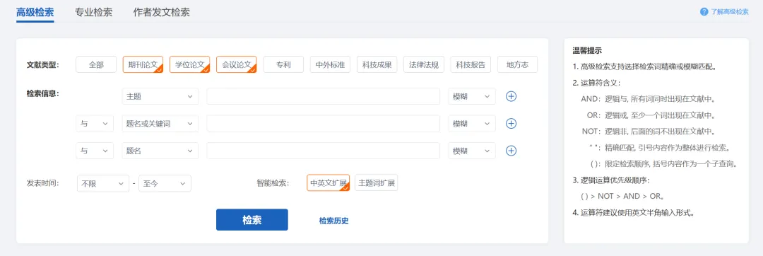 首页检索框的右侧有高级检索的入口,单击进入高级检索界面。高级检索支持多个检索类型、多个检索字段和条件之间的逻辑组配检索,方便用户构建复杂检索表达式。