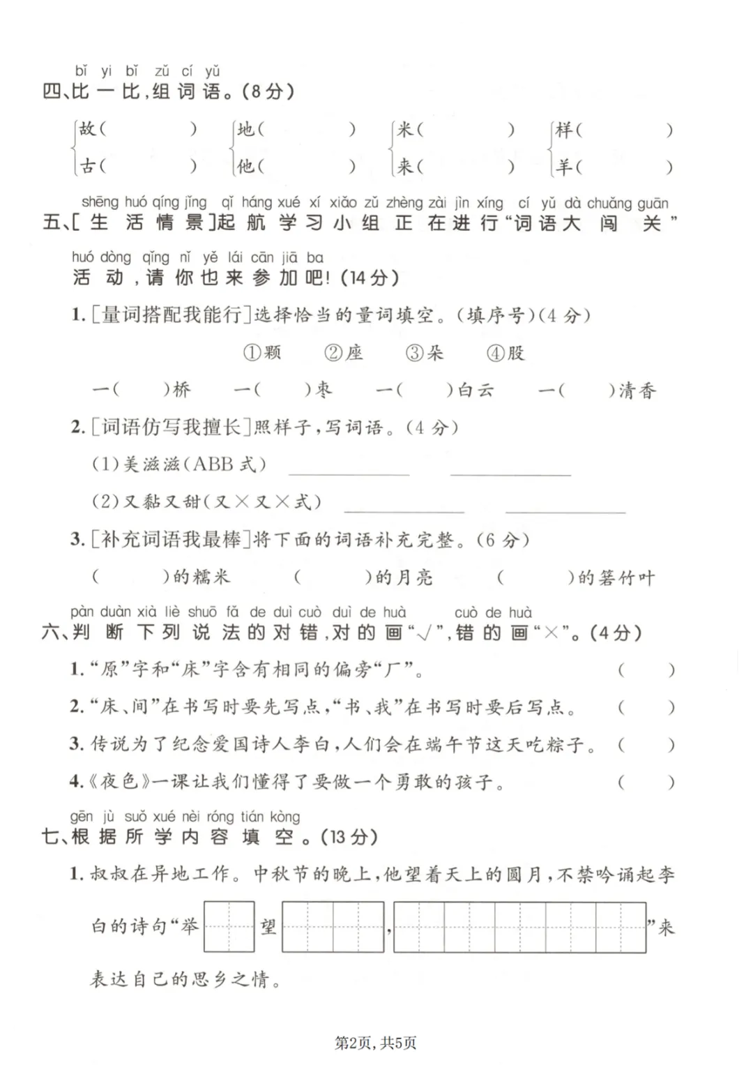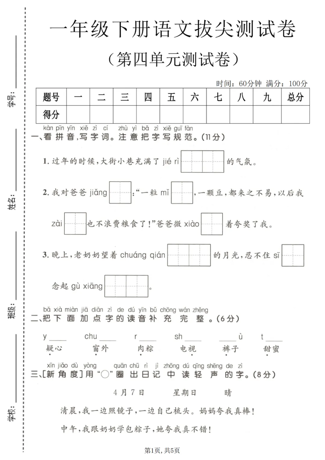 【免费下载】一年级(下)语文 第四单元拔尖测试卷,PDF电子版,可打印