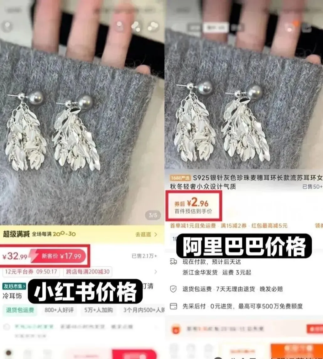 比如这款耳饰,某88上3块钱拿货,搬到小红书卖32.99,卖了2.1万单,差价全是纯利润。