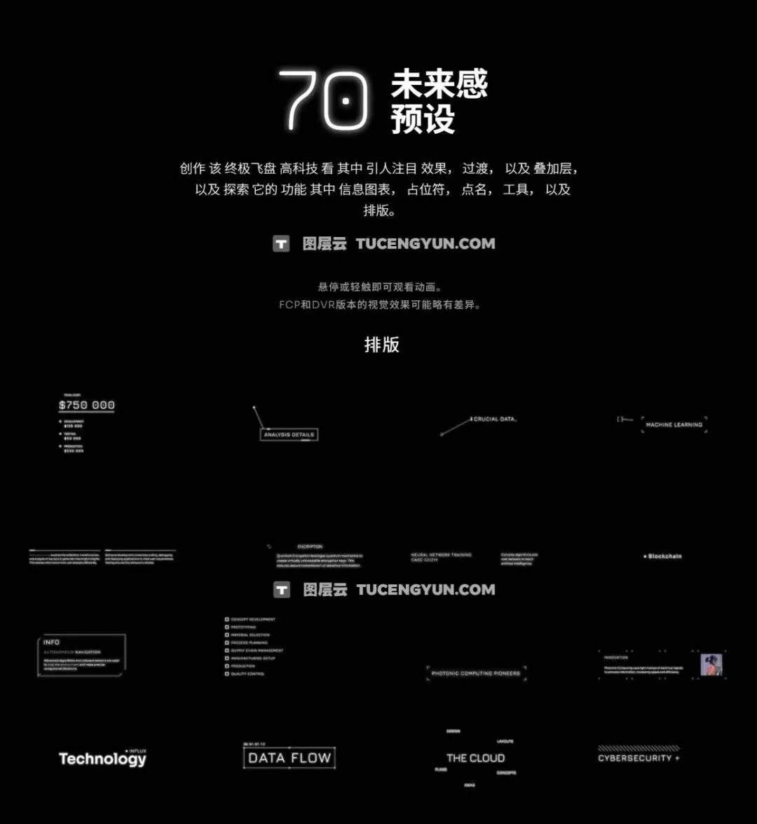 『新品』FCPX插件:70个未来科技感电影VLOG纪录片剪辑文字参数效果转场动画效果包 MotionVFX – mHi-Tech(15255)