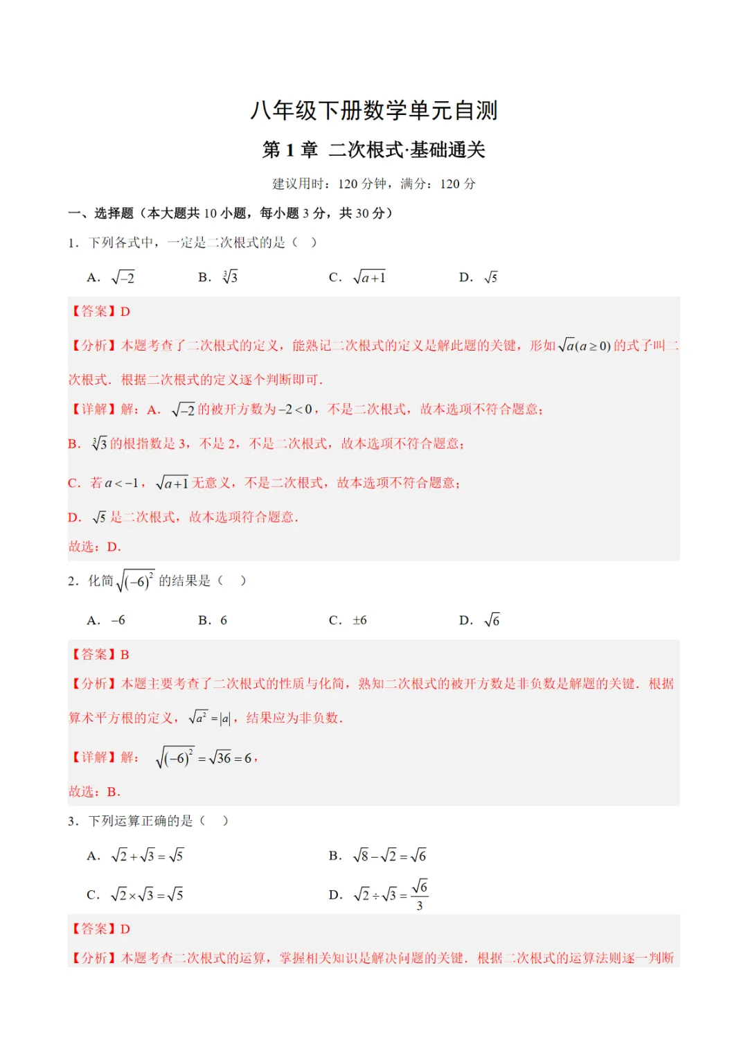 【免费下载】八下数学第1章 二次根式·基础卷(解析版)浙教,可打印