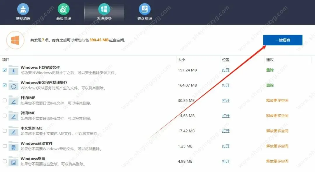 系统瘦身:只需一键操作,就能帮助你快速清理系统中的冗余垃圾文件,删除不必要的系统文件,如系统补丁备份等文件,让系统更加轻盈。