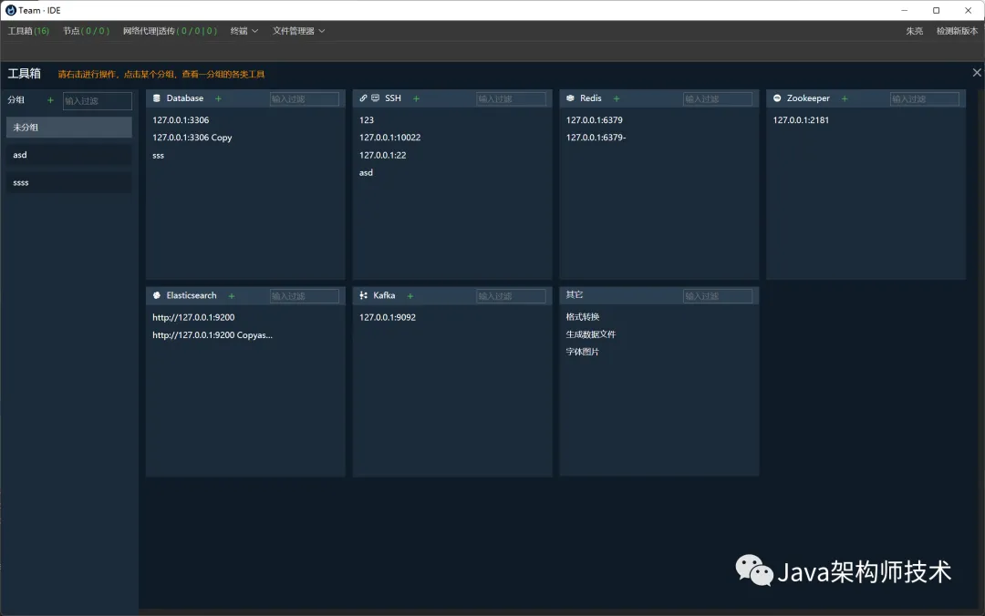 工具箱,用于连接Redis、Zookeeper、Database、SSH、SFTP、Kafka、Elasticsearch等