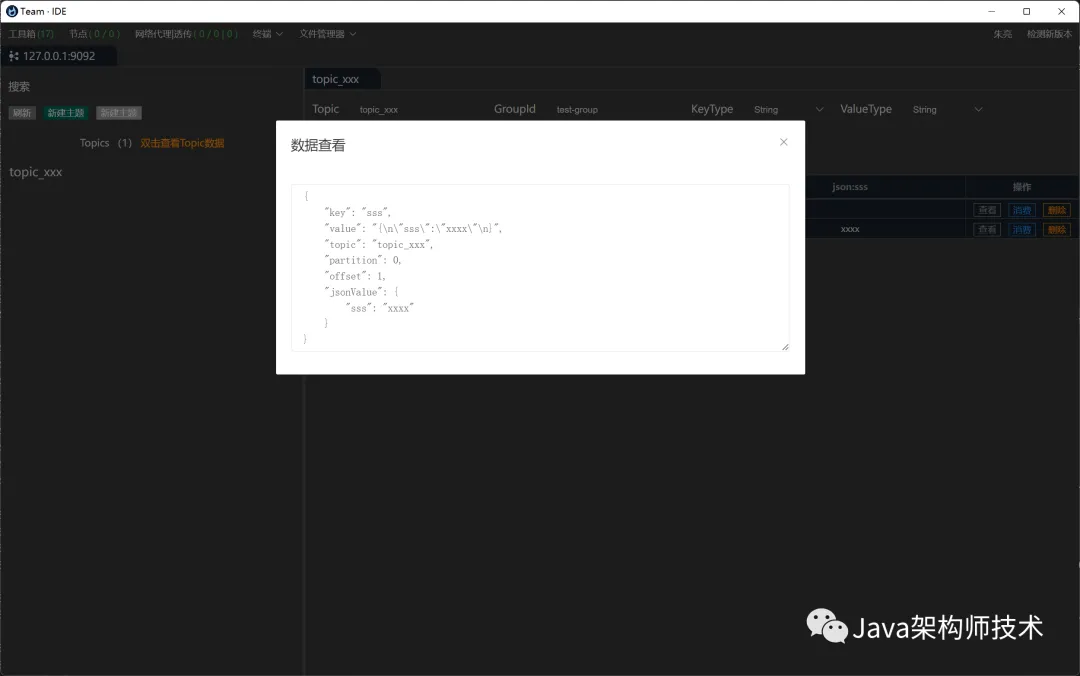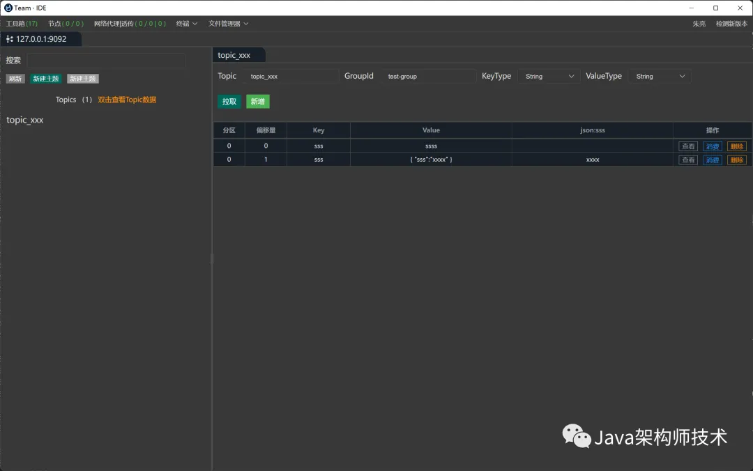 连接Kafka,增删改查主题,推送主题消息,自定义消费主题消息等。另外,搜索公众号顶级架构师后台回复“算法”,获取一份惊喜礼包。