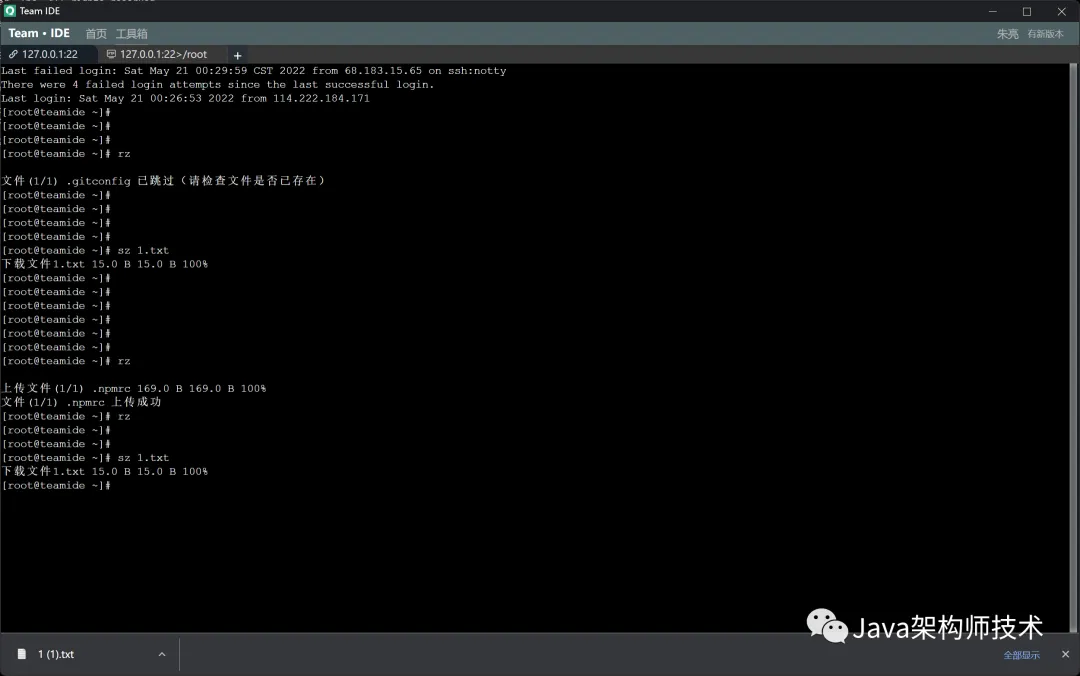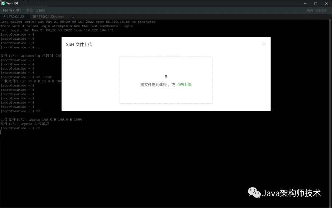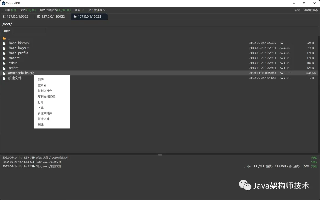 SSH模块可以点击FTP,进行本地和远程文件管理 FTP:上传、下载、移动、本地远程相互移动、重命名、删除、批量上传和下载等功能