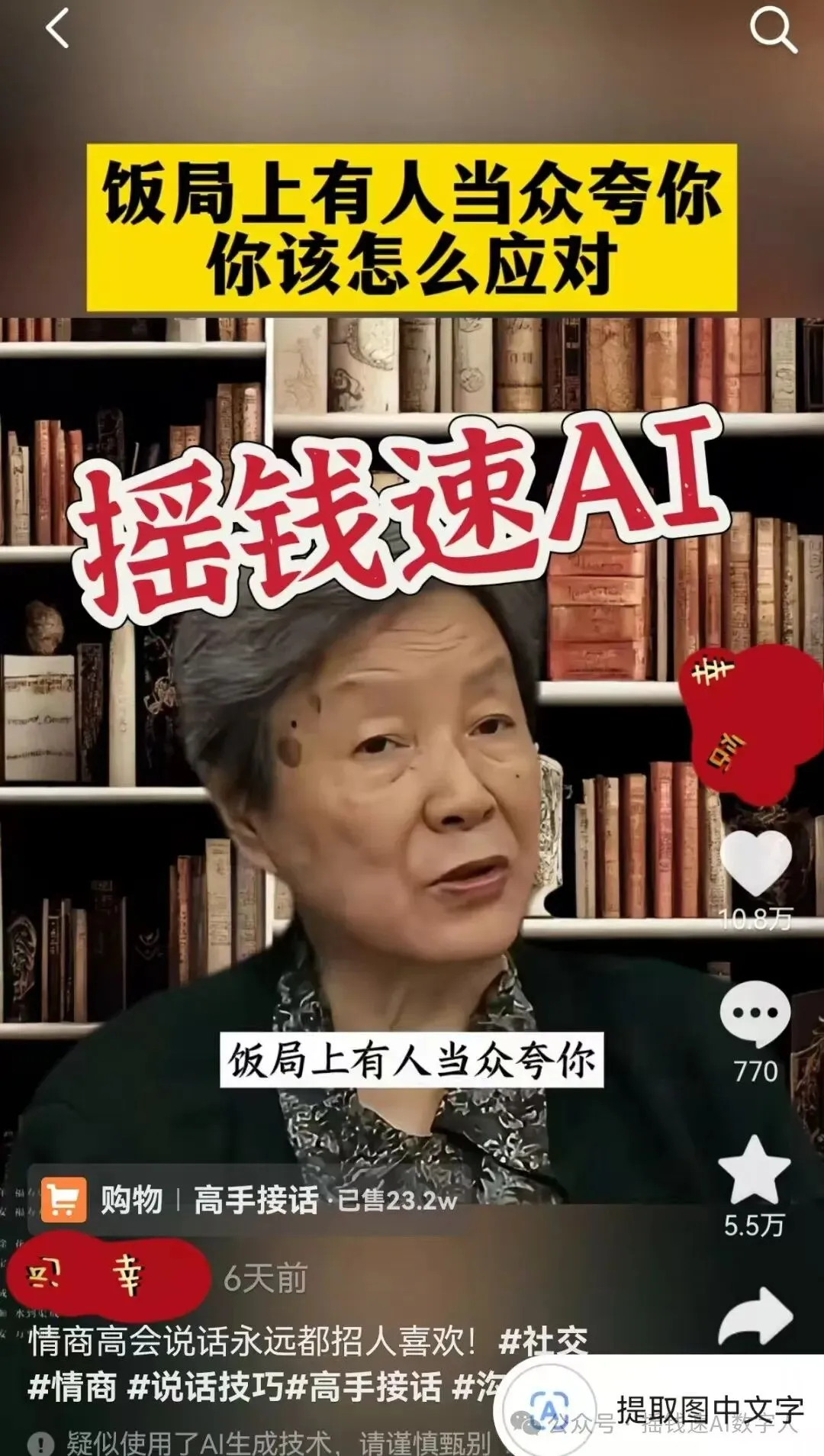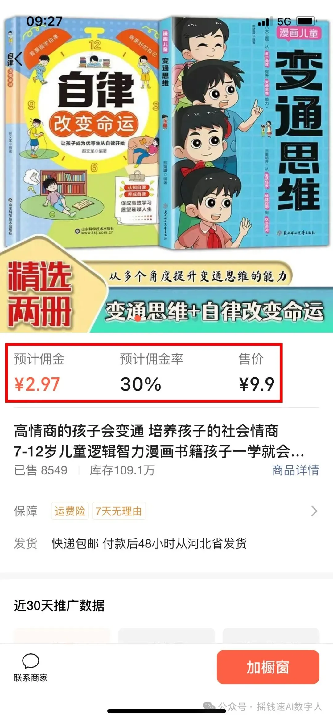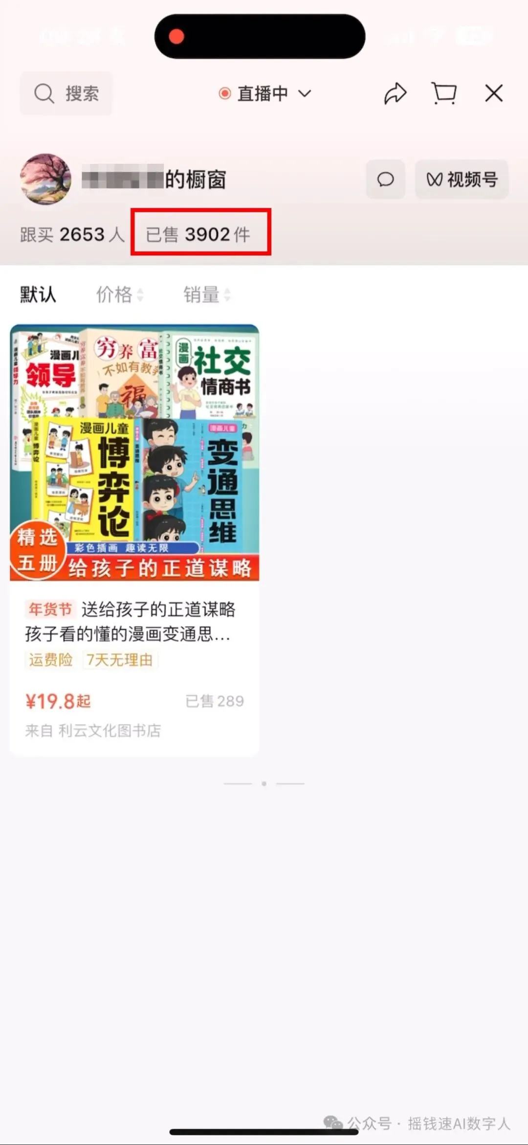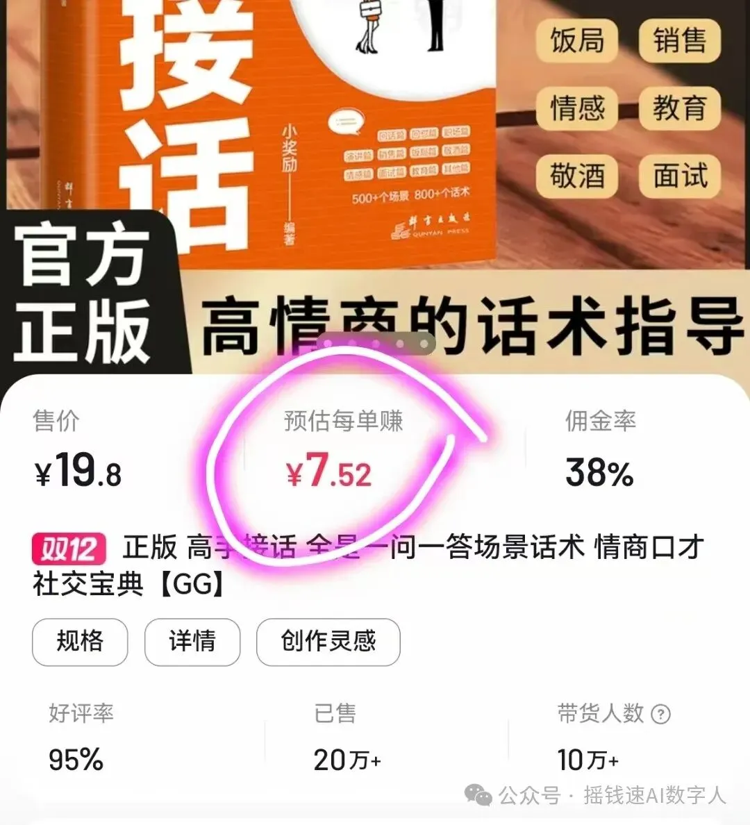 这个账号所的有视频是都用AI数字人软生件成的,视频发布了4天就大爆了两个视频然,后开播直去承接流卖量书籍,目到前为止铺店橱窗一卖共了3900单,卖的书金佣是30%,评看论95%以上人的都是买18.8元(两本套的餐),也就是一能单赚18.8×30%=5.64元,橱窗卖共了3900单,4天所得的利润是:3900单x5.64元=21996元,你说用AI数人字软件生成的频视发布去赚香钱不香?