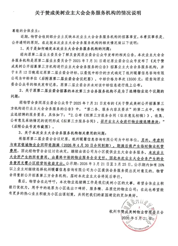 关于赞成美树业主大会会务服务机构的情况说明 以下通知内容已张贴至小区各公告栏,敬请前往查阅; 以下内容同步至杭州市电子业主卡,如需查看请打开“浙里办”或“支付宝”,在首页搜索“杭州市电子业主卡”同步查看。