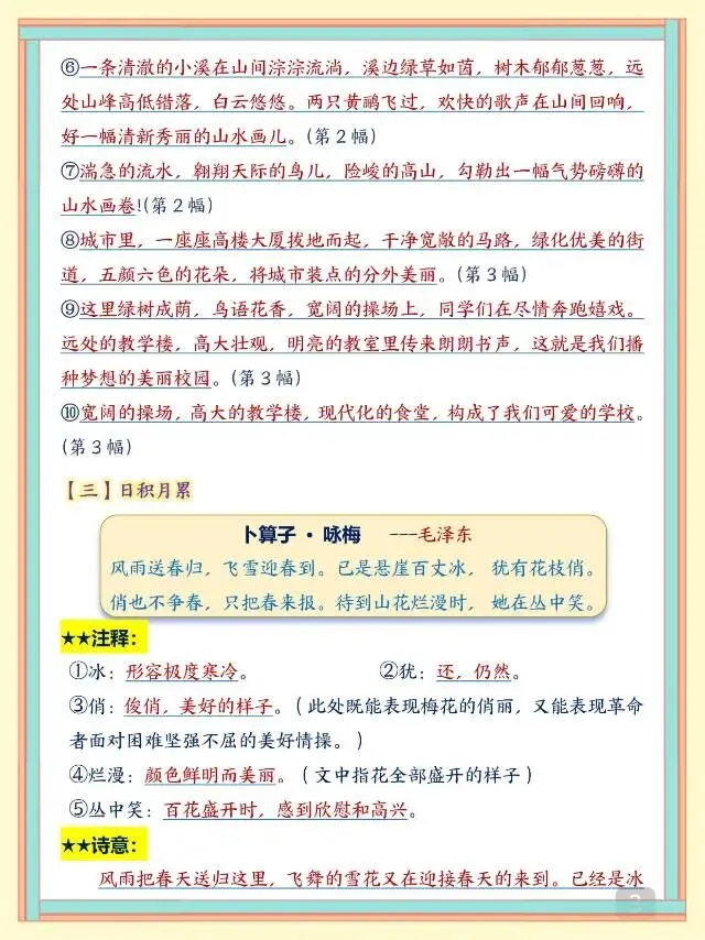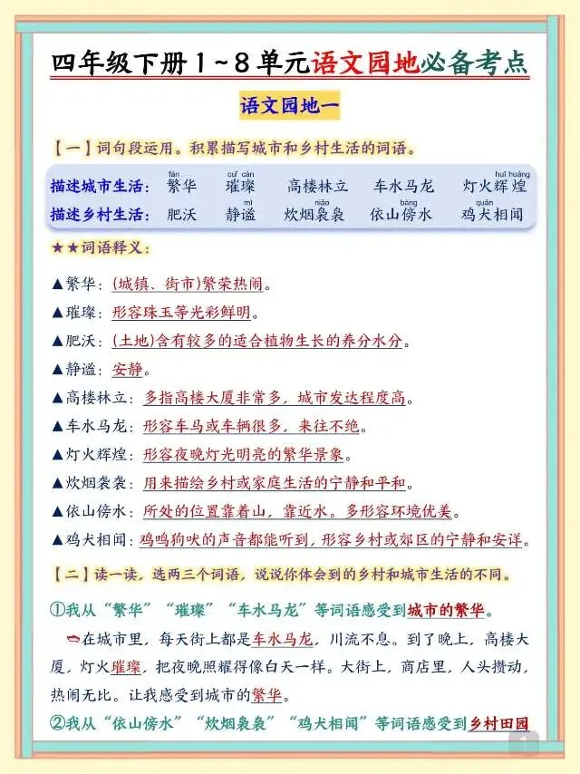 这份26春四年级下册语文1-8单元必备考点,聚焦各单元语文园地核心知识,涵盖词句段运用、日积月累、识字技巧、阅读写作方法等关键考点,还搭配释义、赏析、仿写示例和知识点梳理,针对性极强。